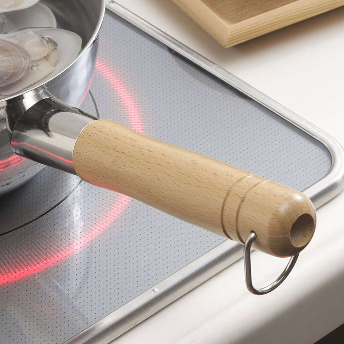 ブナ材の天然木ハンドルは手にしっかり馴染み、熱くなりにくいので持ちやすさ抜群です。見た目にも温かみがあり、キッチンにやさしく溶け込みます。