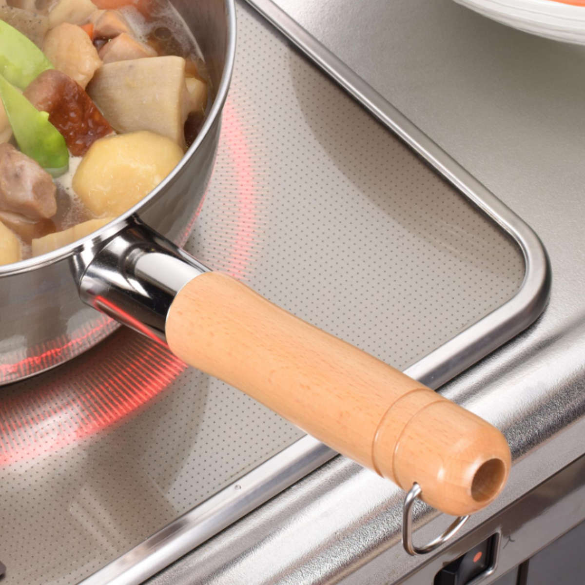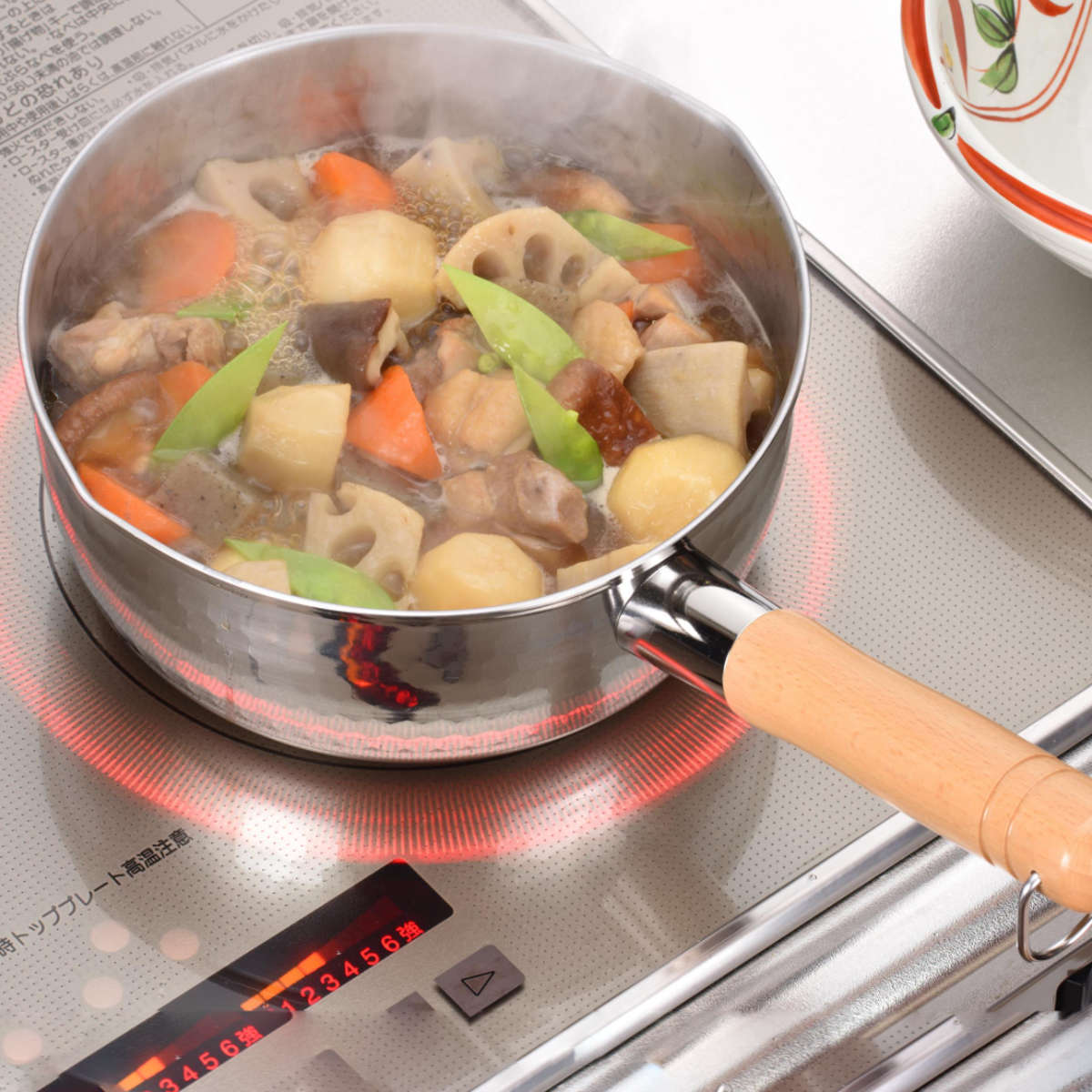 ブナ材の天然木ハンドルは手にしっかり馴染み、熱くなりにくいので持ちやすさ抜群です。見た目にも温かみがあり、キッチンにやさしく溶け込みます。