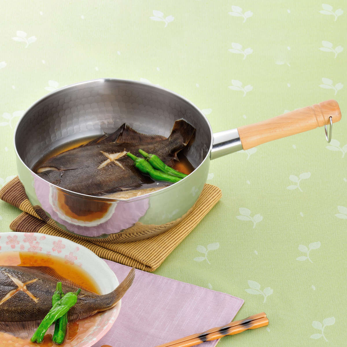 | 材質 | 本体:ステンレス鋼(クロム21%、底厚0.8mm) ハンドル:天然木(ブナ材、ウレタン塗装) ハンドルフック:ステンレス鋼(クロム18%・ニッケル8%) |