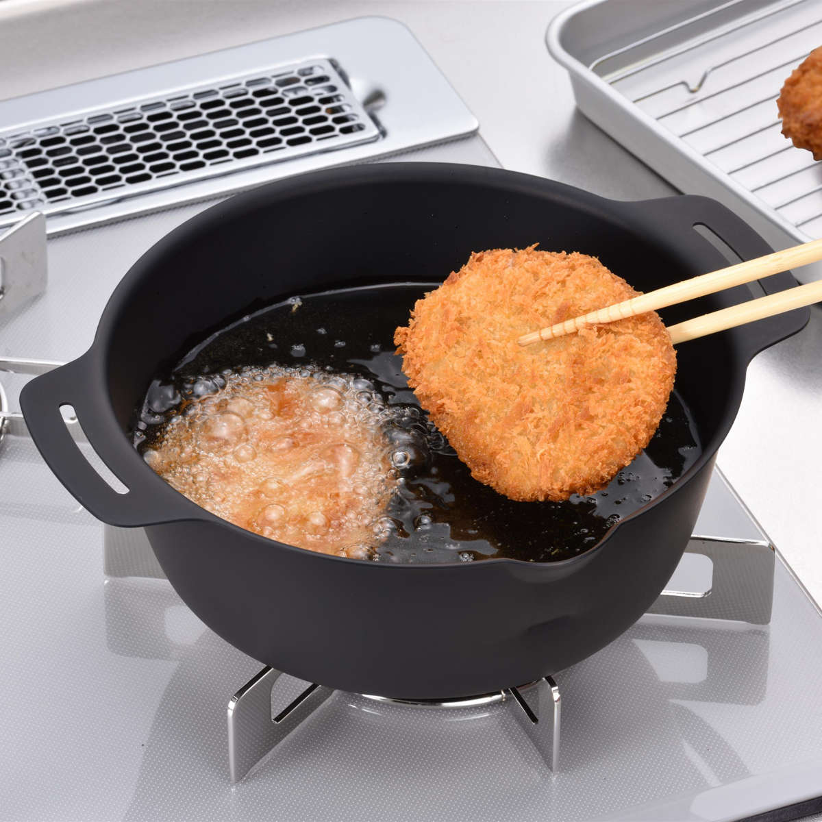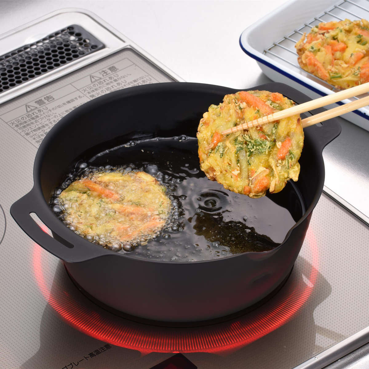油がよく対流する丸底形状で、揚げ物がムラなくカラッと仕上がる天ぷら鍋です。油温が一定に保たれやすく、から揚げ・天ぷら・コロッケなども均一に揚がり、外はサクッと中はジューシーに仕上がります。