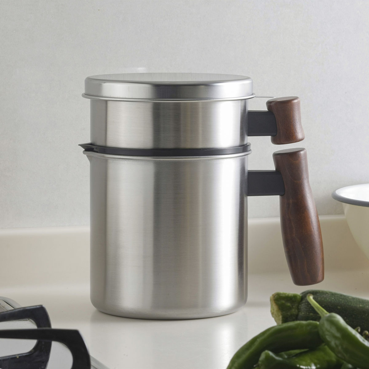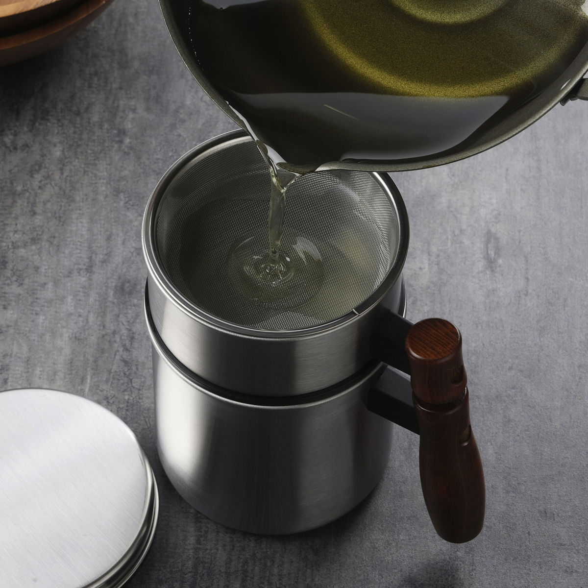 汚れやニオイをろ過して油を清潔に保存できるオイルポット