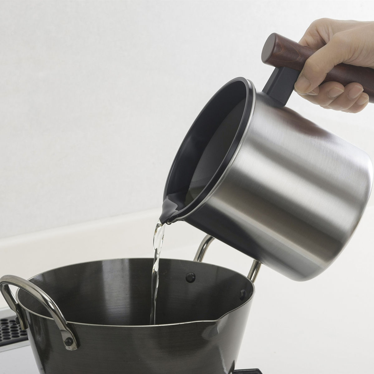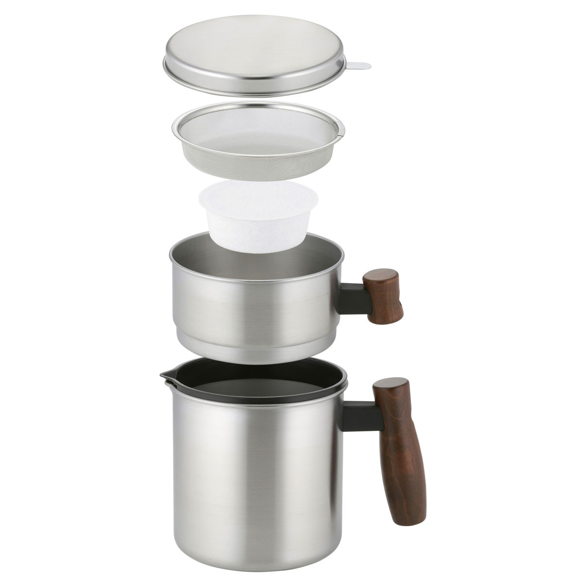 | 材質 | 本体・フタ・ロート:ステンレス鋼 ハンドル:天然木 ハンドル止め具・2重口リング:ナイロン樹脂 アミ:ステンレス鋼(クロム18%・ニッケル8%) 活性炭カートリッジ:木質系活性炭・不織布(レーヨン) |