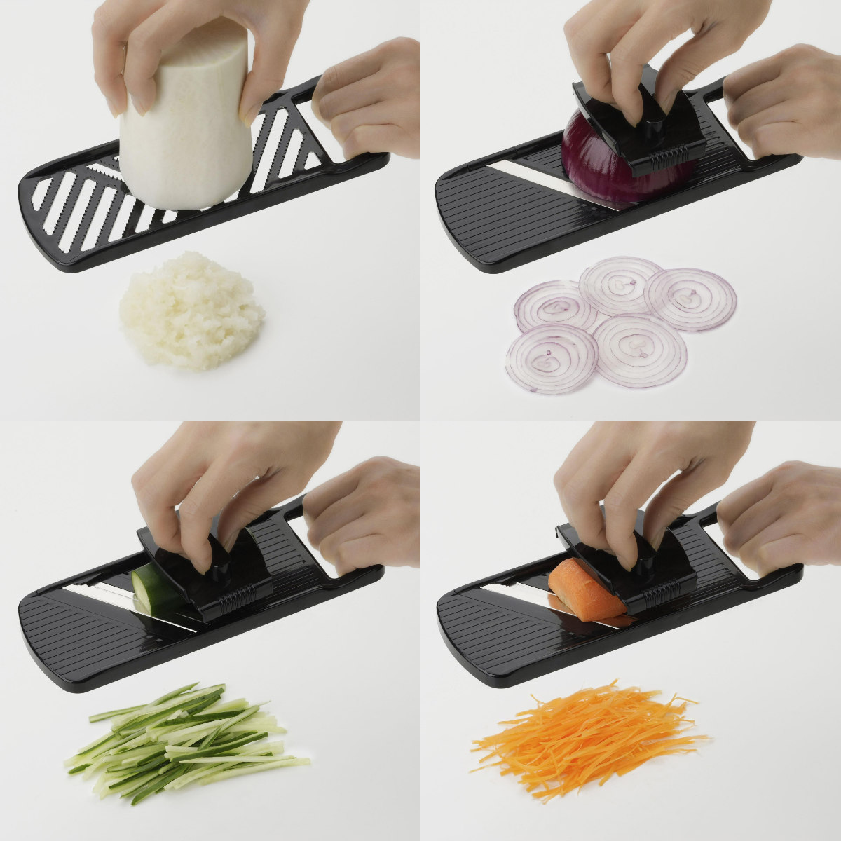 ●千切り、つま切り、スライス、おろしの4通りに対応しています。