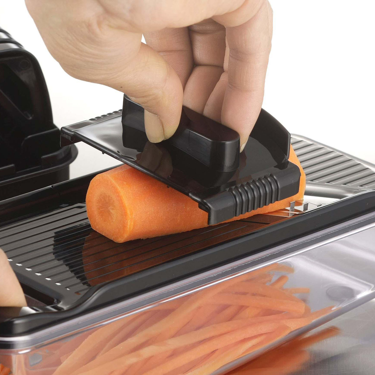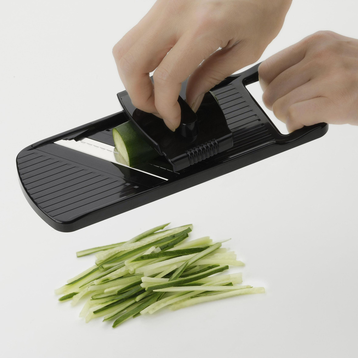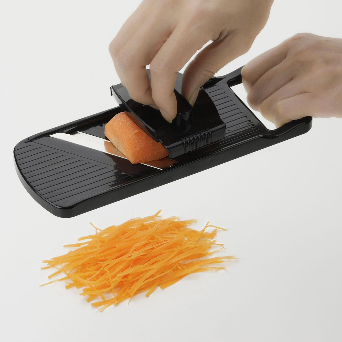 専用ホルダー付きで、小さくなった野菜も最後までしっかりカットできます。手を傷つけにくく、安心してお使いいただけます。