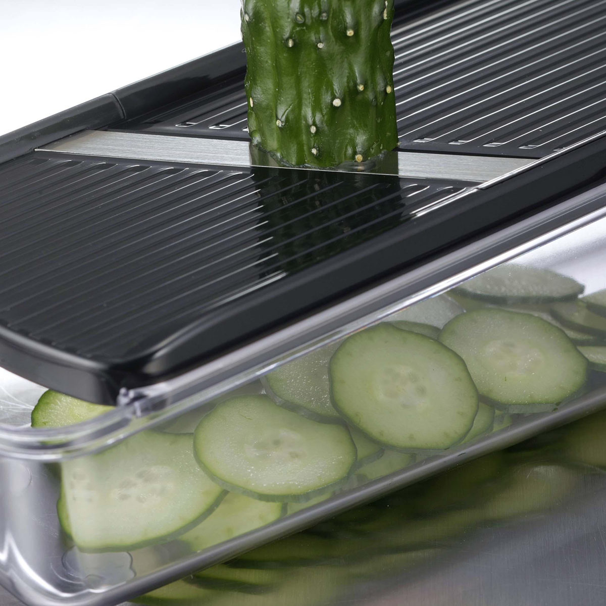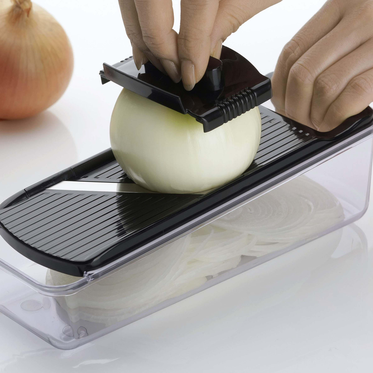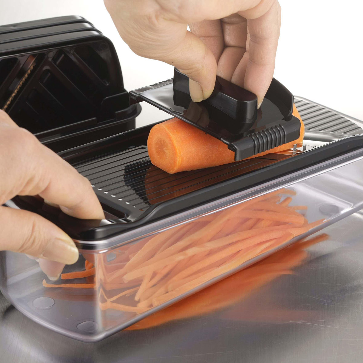 専用ホルダー付きで、小さくなった野菜も最後までしっかりカットできます。手を傷つけにくく、安心してお使いいただけます。