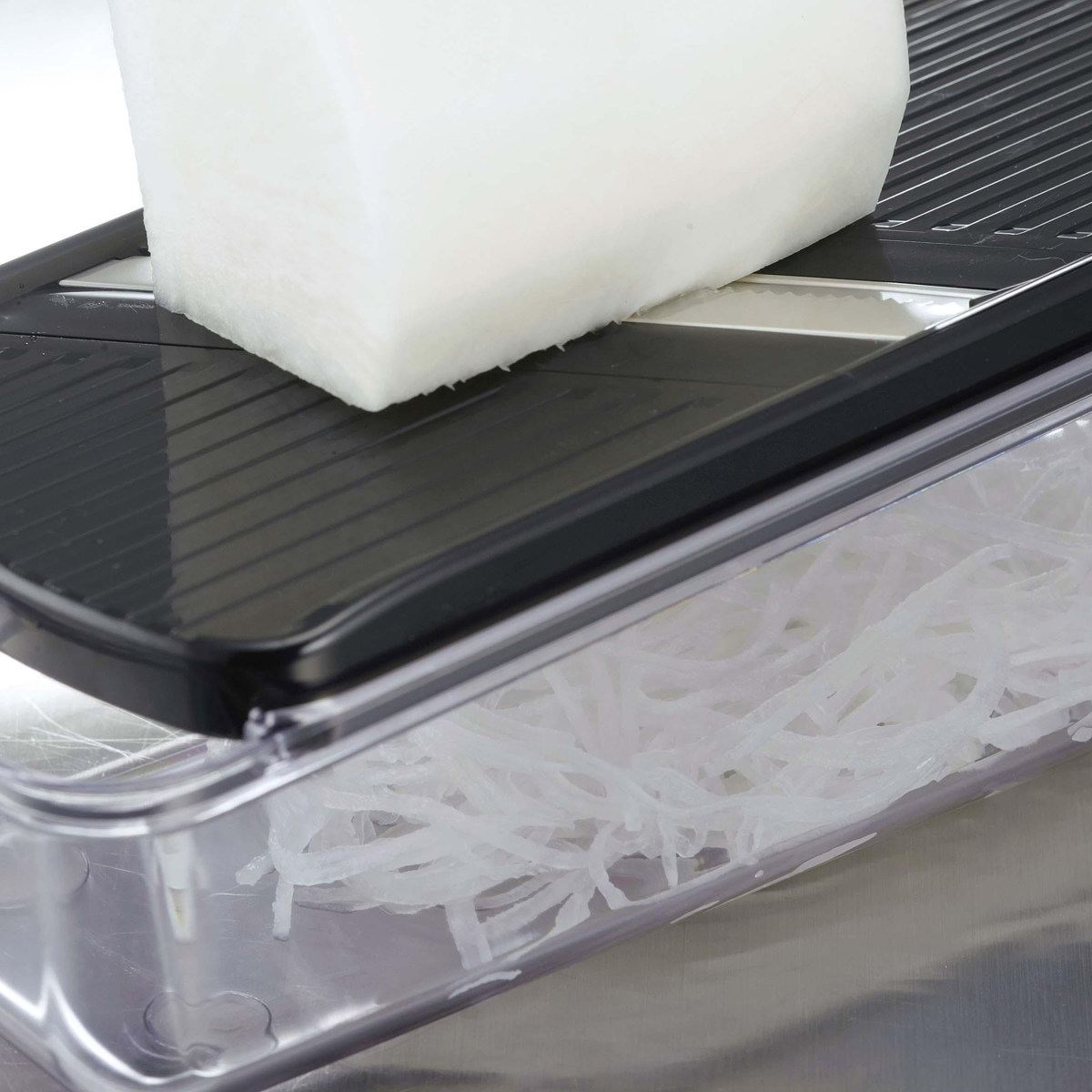 千切り・つま切りプレートには、安全性に配慮したボックス刃を採用しています。刃が外れる心配がなく、安定した使い心地です。角のある切り口で、シャキシャキとした食感に仕上がります。