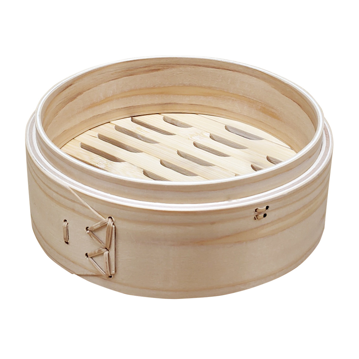 日本製のひのきを使用し、蒸し料理の本場・中国で培われた高い蒸篭製造技術により、丁寧に仕上げています。竹を編んだ蓋と本体のすのこは蒸気をほどよく逃がし、食材をふっくらとおいしく蒸し上げます。外側に巻いたひのきが温かさを保ち、安定した蒸し料理をサポートします。