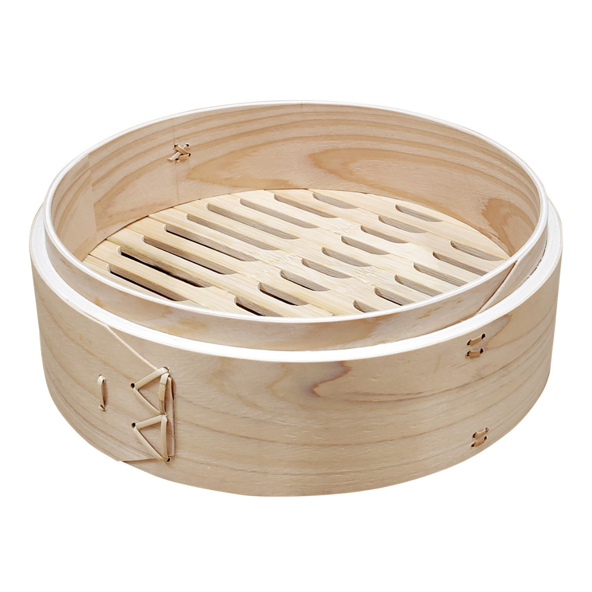 日本製のひのきを使用し、蒸し料理の本場・中国で培われた高い蒸篭製造技術により、丁寧に仕上げています。竹を編んだ蓋と本体のすのこは蒸気をほどよく逃がし、食材をふっくらとおいしく蒸し上げます。外側に巻いたひのきが温かさを保ち、安定した蒸し料理をサポートします。