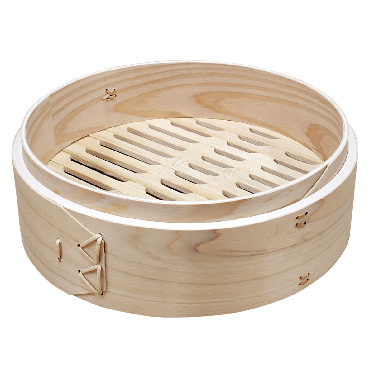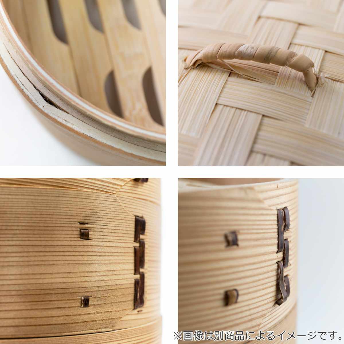 日本製のひのきを使用し、蒸し料理の本場・中国で培われた高い蒸篭製造技術により、丁寧に仕上げています。竹を編んだ蓋と本体のすのこは蒸気をほどよく逃がし、食材をふっくらとおいしく蒸し上げます。外側に巻いたひのきが温かさを保ち、安定した蒸し料理をサポートします。