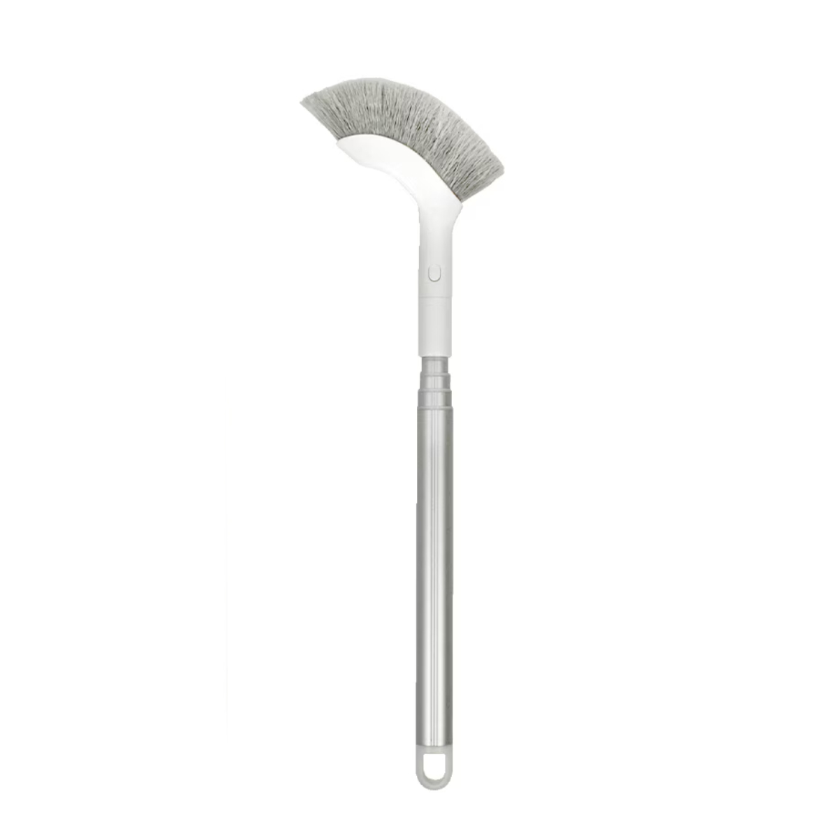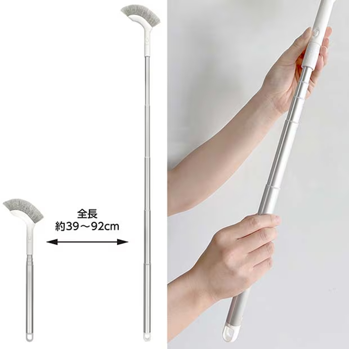 指示棒のように引っ張るだけで、簡単に柄の長さを調節できる伸縮ブラシです。高いところのお掃除から手元のお掃除まで、簡単に柄の長さを切り替えることができます。
