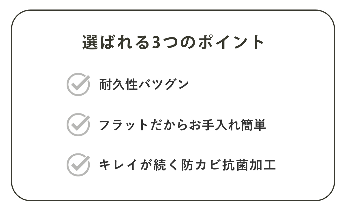 フチ部分に抗菌素材を使用しているので、カビやヌメリが発生しにくいです。家族全員が毎日使うものだからこそ、キレイが続くと安心です。
