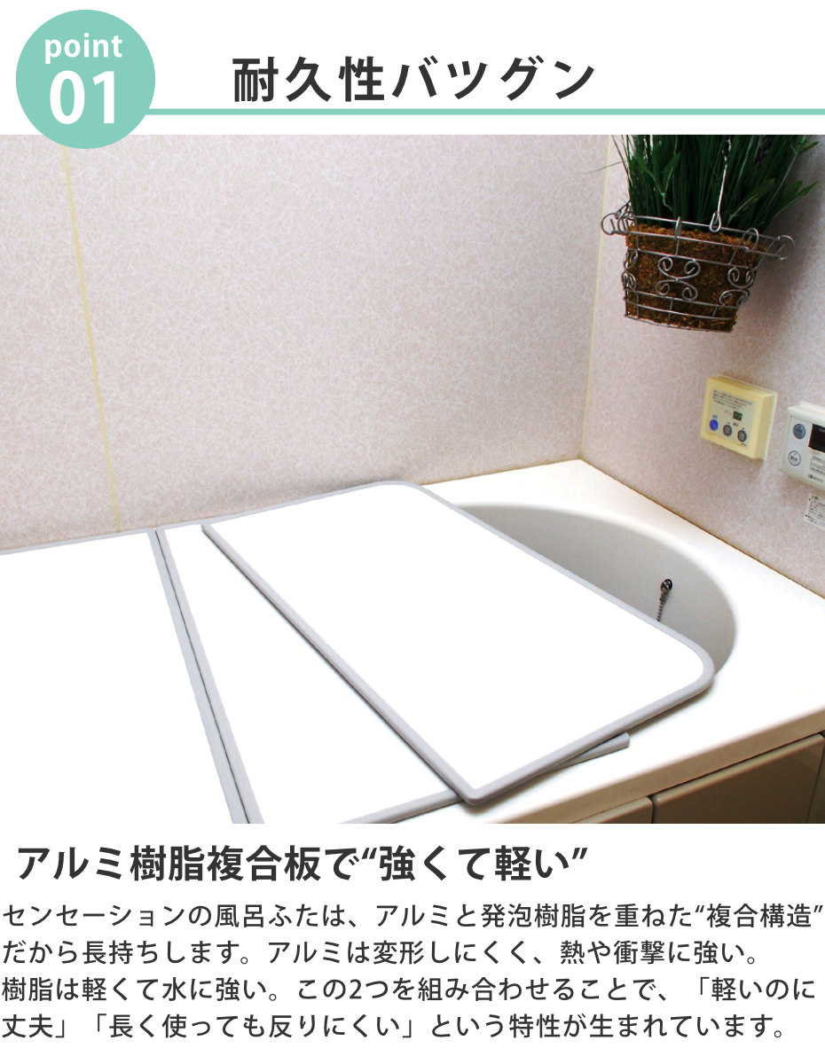 センセーションの風呂ふたは、アルミと発泡樹脂を重ねた「複合構造」なので長持ちします。アルミは変形しにくく、熱や衝撃に強い。樹脂は軽くて水に強い。この2つを組み合わせることで、「軽いのに丈夫」「長く使っても反りにくい」という特性が生まれています。