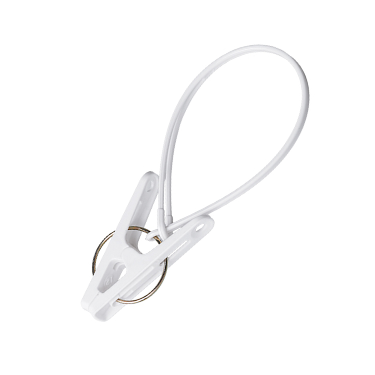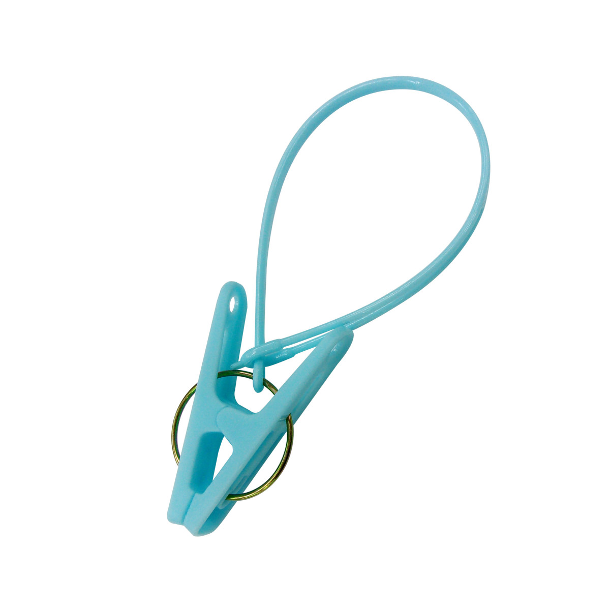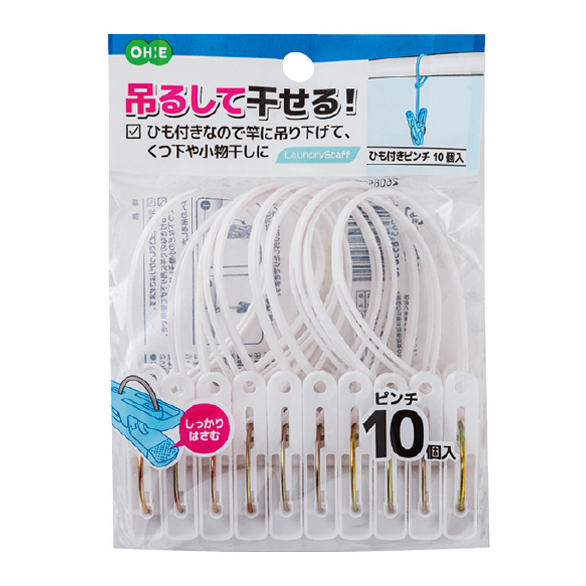 先端に凹凸が付いているので、洗濯物をしっかり挟めます。ひも付きなので竿に吊り下げて使用でき、くつ下などの小物干しに便利です。