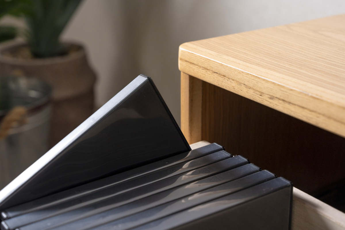 DVDディスクやリビング周りの小物の収納に最適な引出しは、全てフルスライドレール仕様で奥までしっかりと見渡せます。たっぷり収納しても開閉がスムーズです。