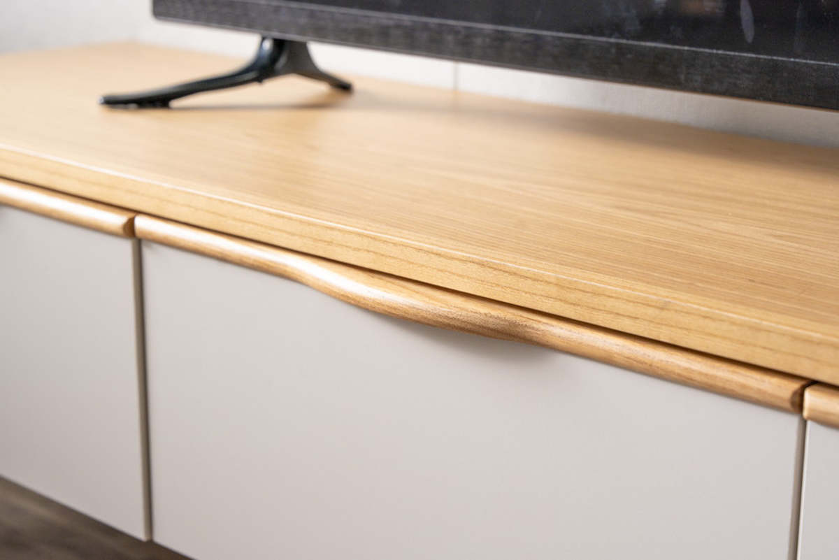 環境に配慮したFSC認証を取得した天然木工芸突板を使用したテレビ台です。ナチュラルな突板のフレームに前板のグレージュが、お部屋を優しい雰囲気にコーディネートしてくれます。背面は化粧仕上げが施され、細部まで手を抜かず、丹精込めて製造されています。