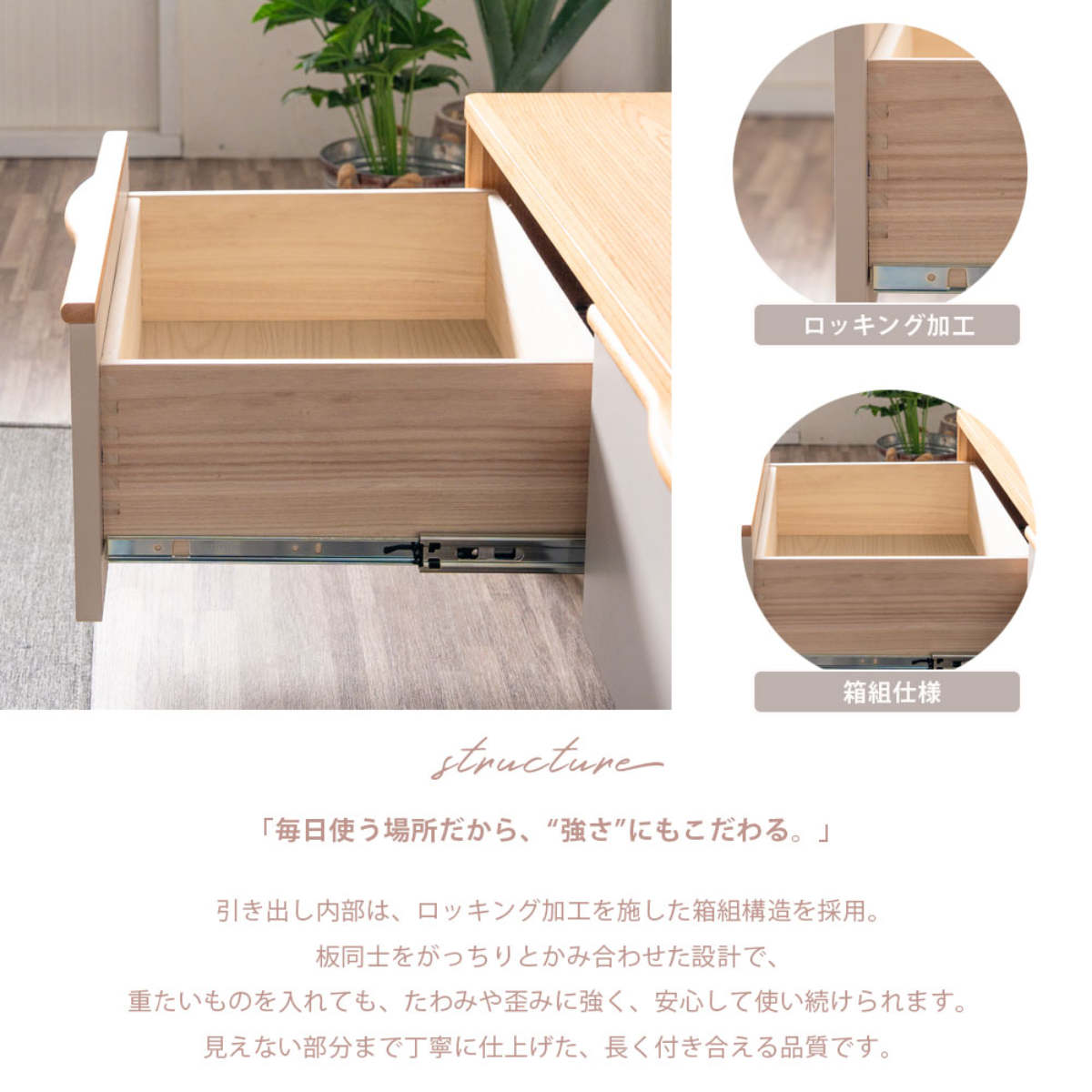 | 材質 | 天板、側板:天然木工芸突板 前板:メラミン化粧板 脚:天然木 塗装:ウレタン塗装 |