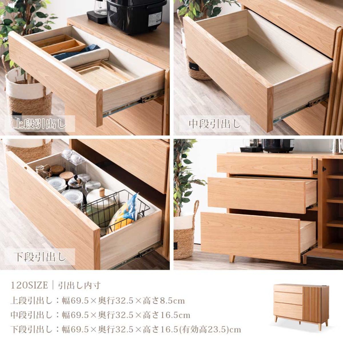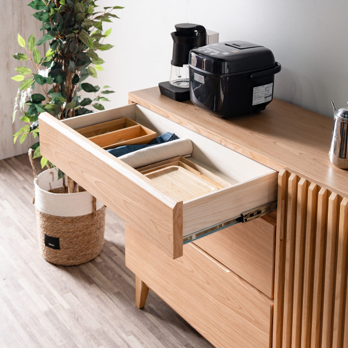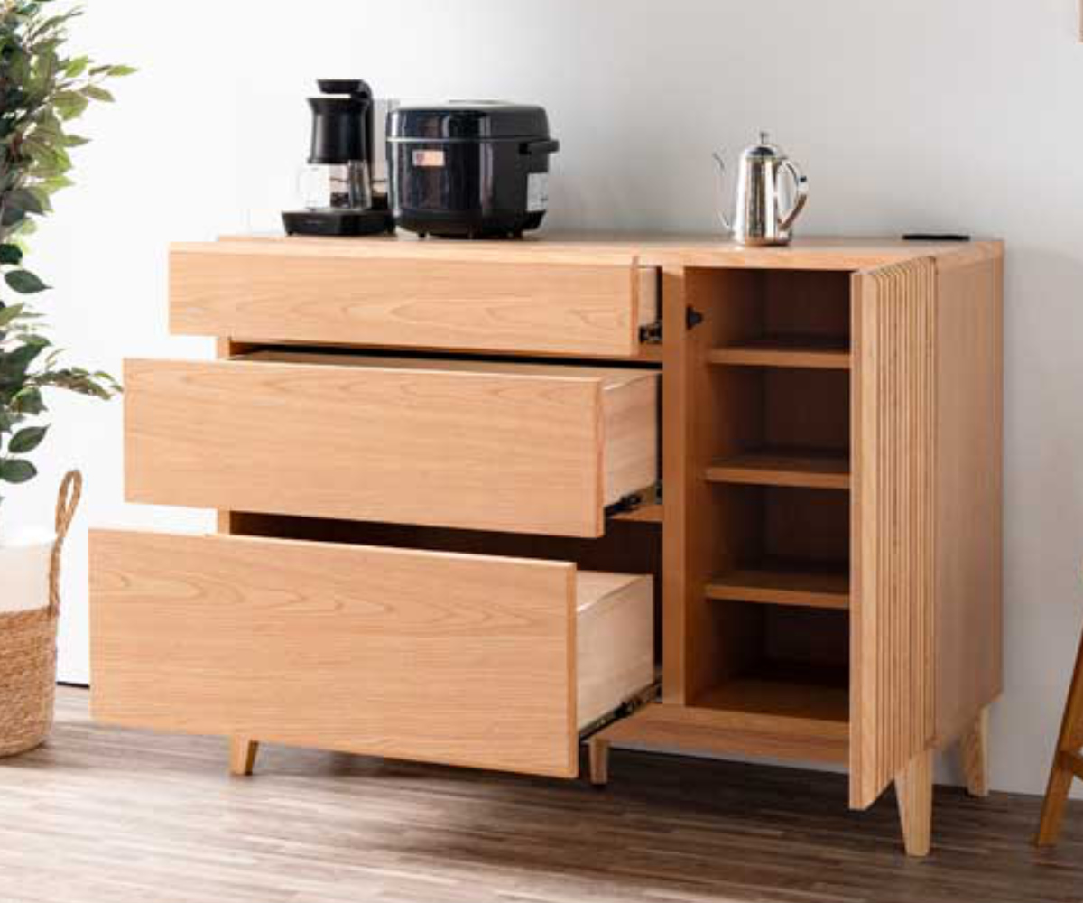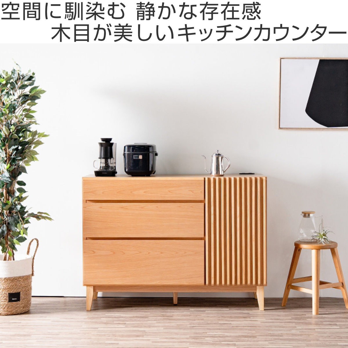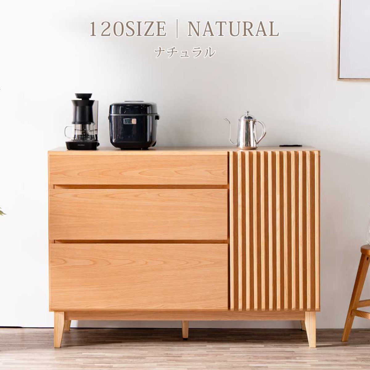 キッチン周りの小物や調理家電をすっきりまとめて収納できる、キッチンカウンターです。天板・前板は天然木突板でやさしい木目が空間になじみ、幅120cmのゆったりサイズで、引出し・扉収納を備えた使いやすい設計です。リビング収納としても活躍し「見せる家具」としても楽しめます。