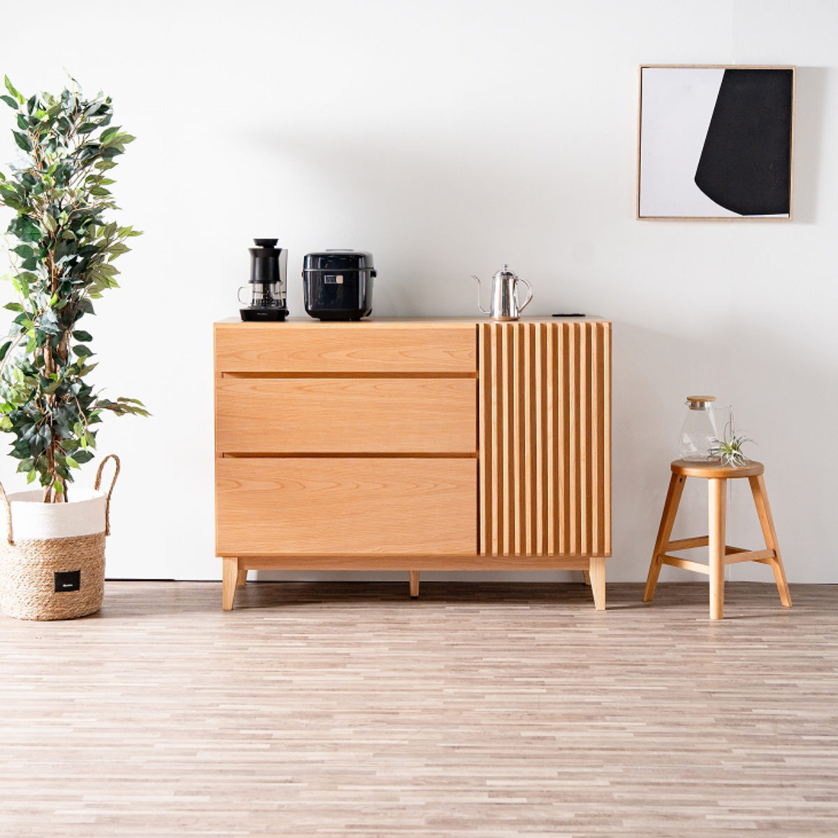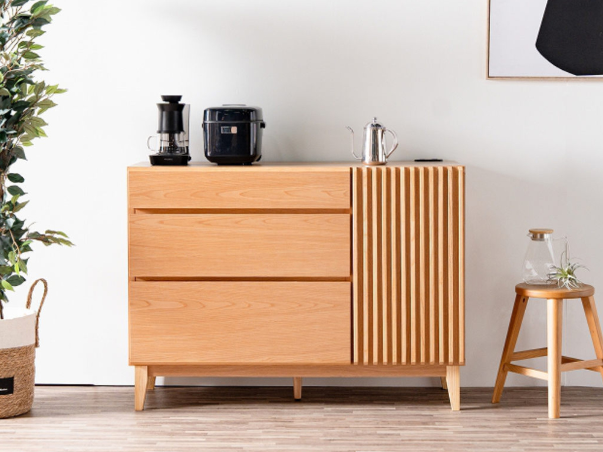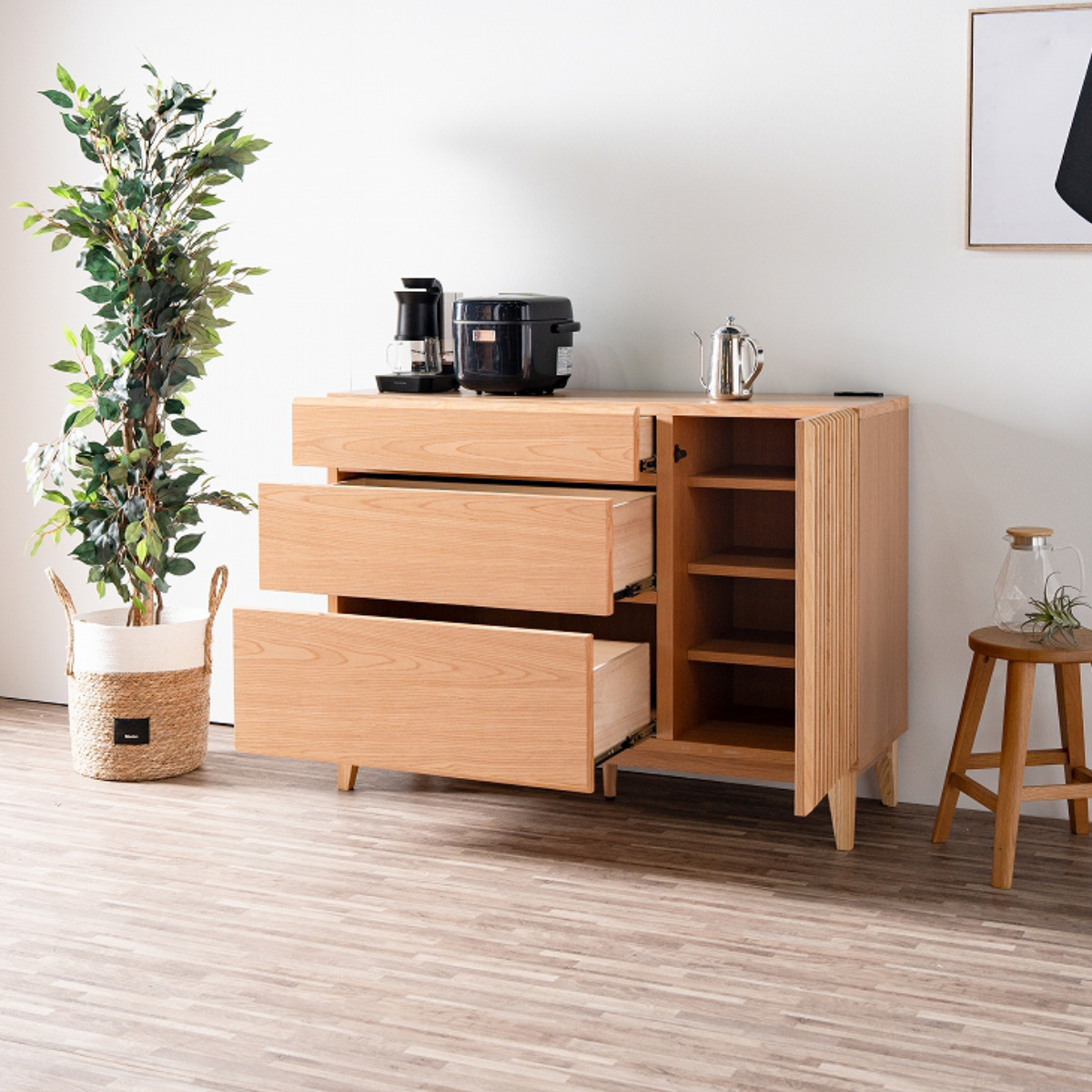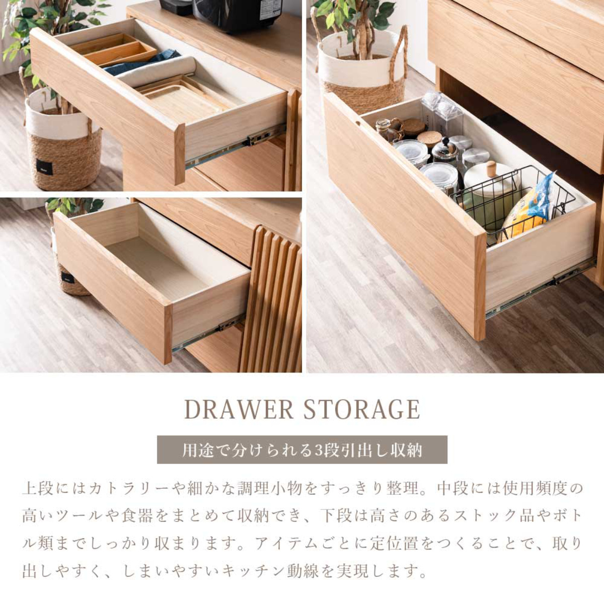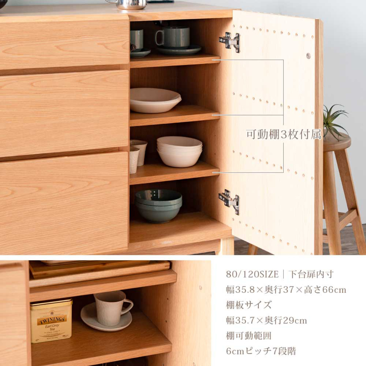 キッチン周りの小物や調理家電をすっきりまとめて収納できる、キッチンカウンターです。天板・前板は天然木突板でやさしい木目が空間になじみ、幅120cmのゆったりサイズで、引出し・扉収納を備えた使いやすい設計です。リビング収納としても活躍し「見せる家具」としても楽しめます。