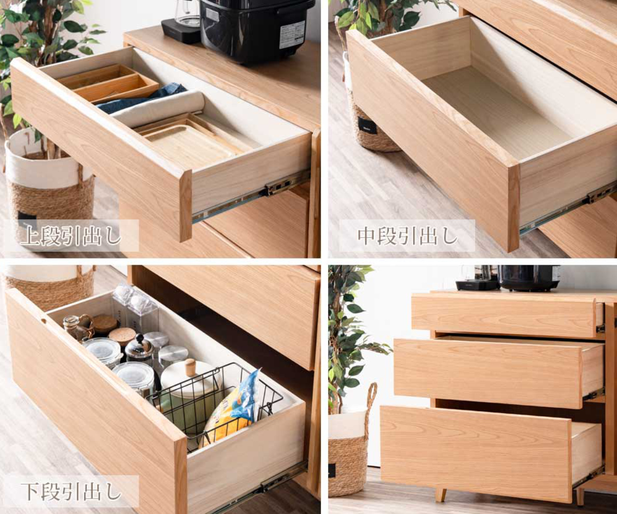 | 引き出し | 3杯 フルオープンレール仕様 浅型1段、深型2段 |