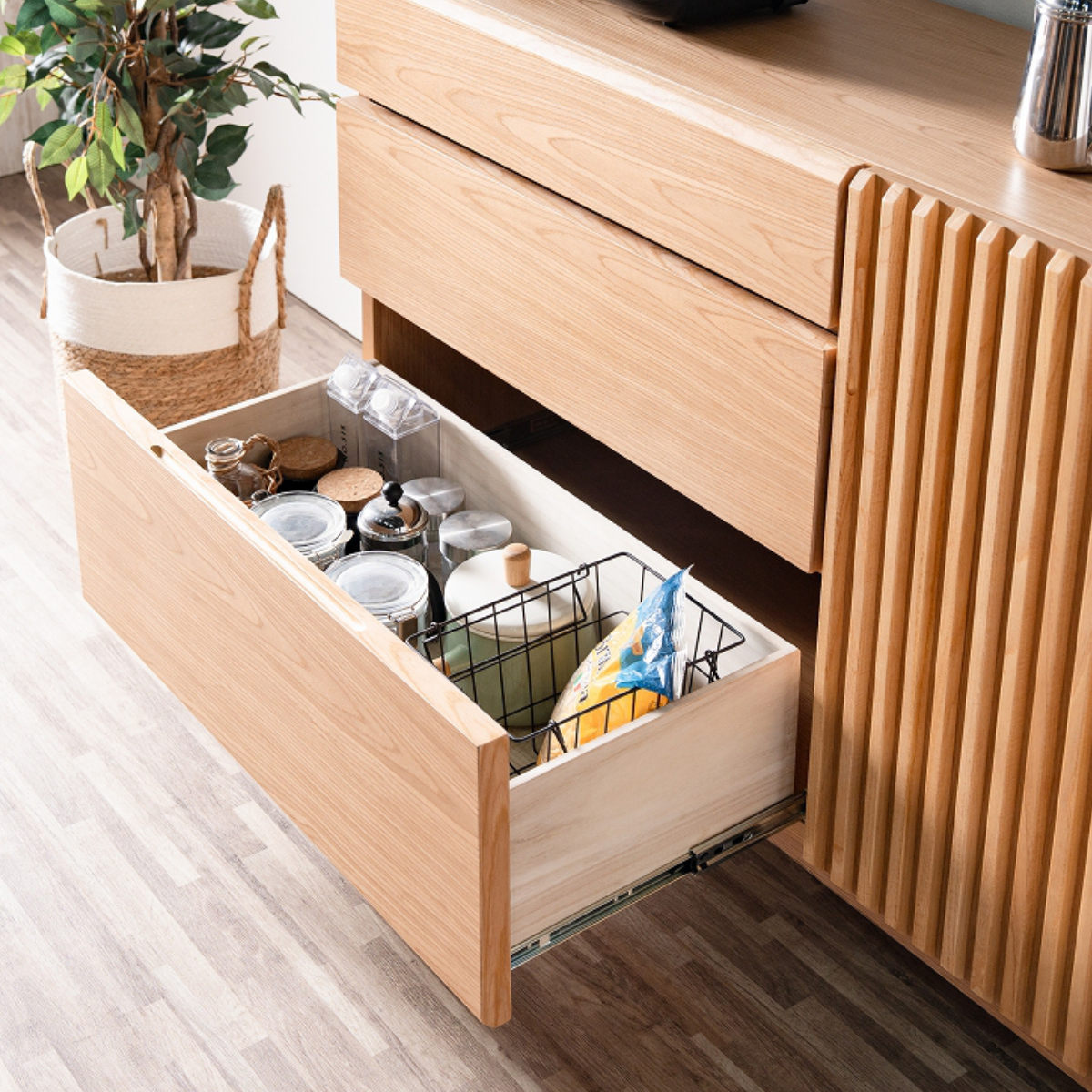 引出し+扉収納で、用途に合わせて使い分けできます。 生活感の出やすい小物やストックもすっきり隠せます。散らかりがちな空間も、自然と片付く収納力です。