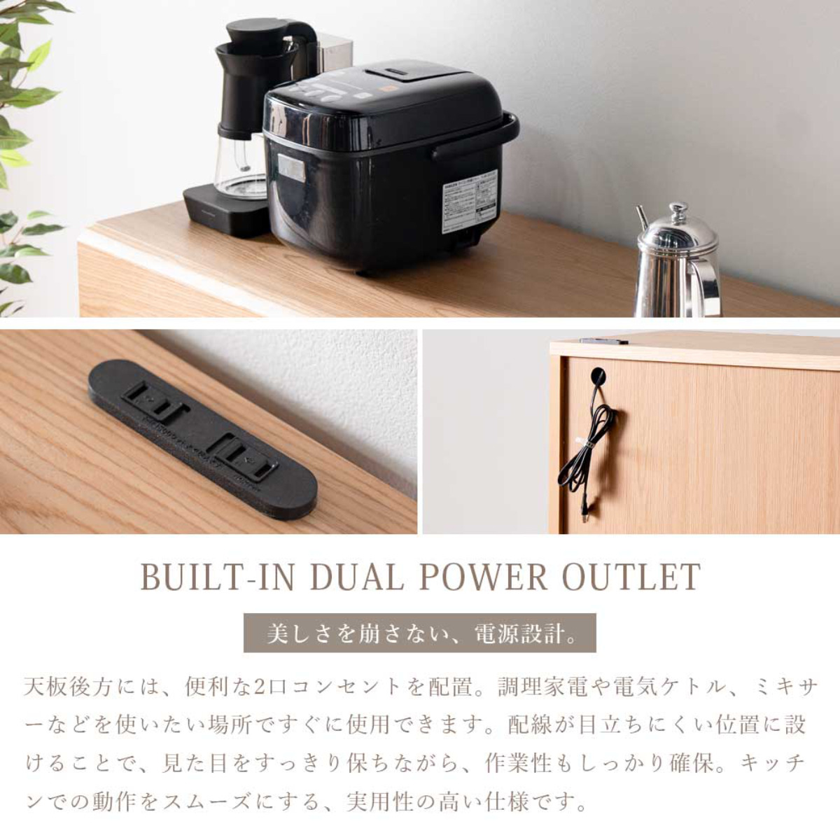天板後ろに2口コンセントを備え、家電をすぐに使える便利な仕様です。配線穴付きで、コードを背面に通せるため、見えないように配線できます。