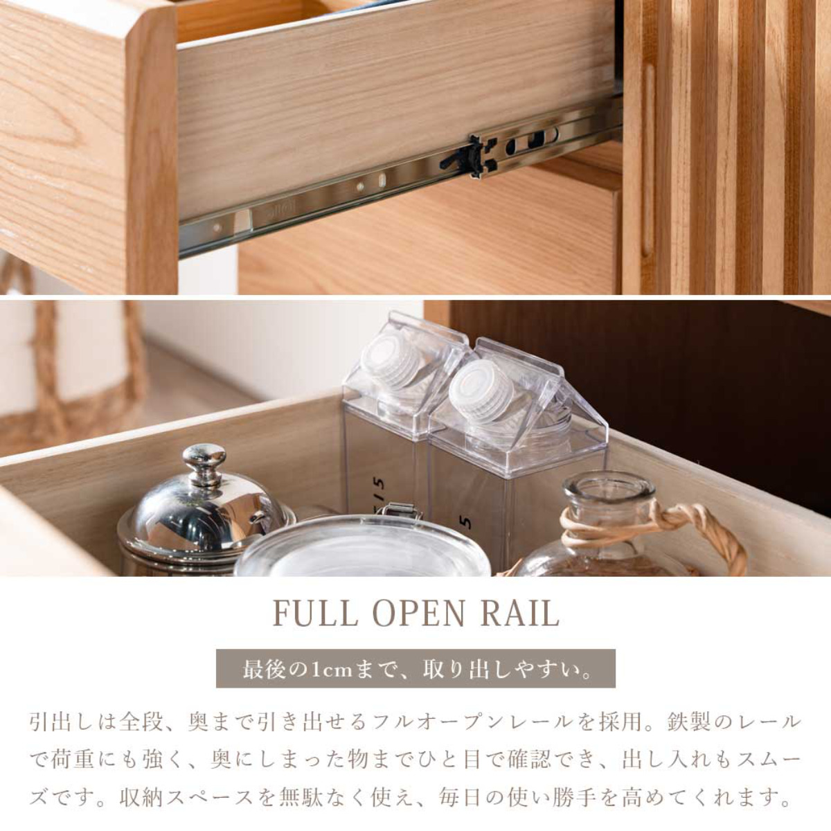 引出しにはロッキング加工を採用しており、勢いよく引いても抜け落ちず安心です。さらにフルオープンレール仕様で、奥の収納もラクに取り出せます。