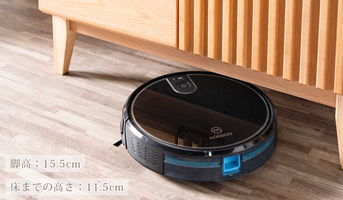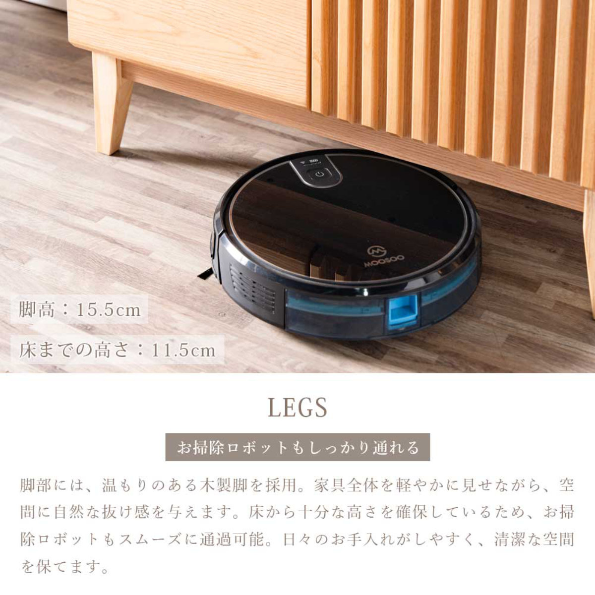 天然木を使用した脚部の高さは15.5cm。床下にしっかりスペースを確保するので、ロボット掃除機もスムーズに通れて、掃除もしやすくなります。