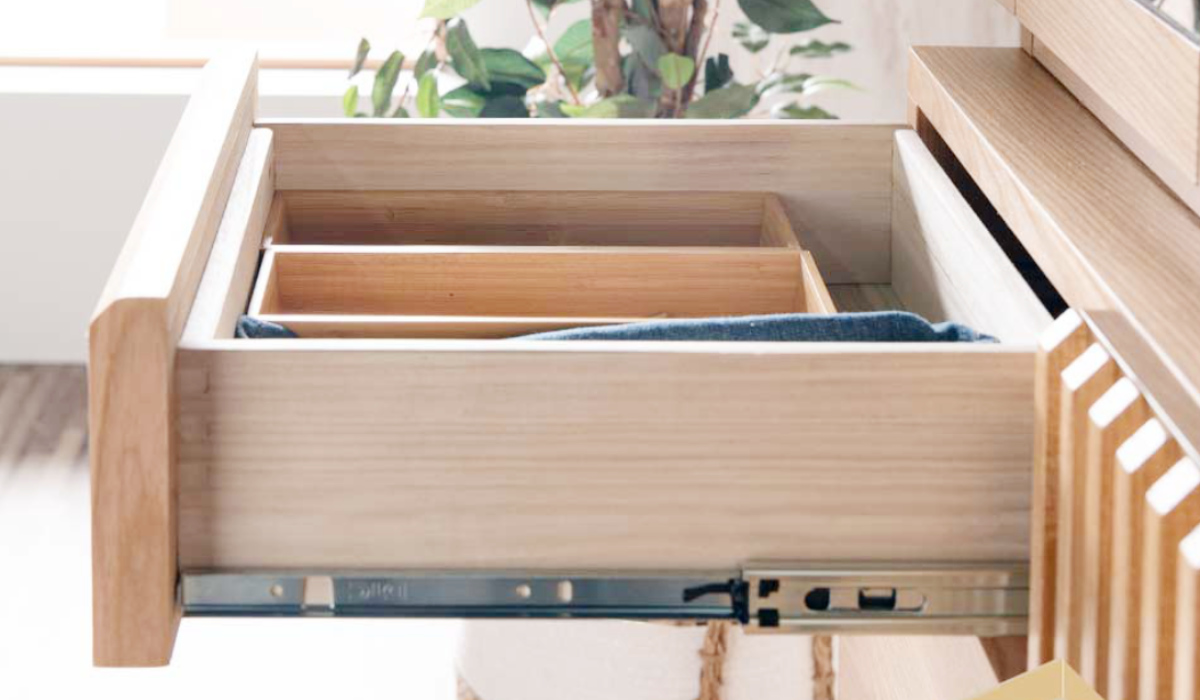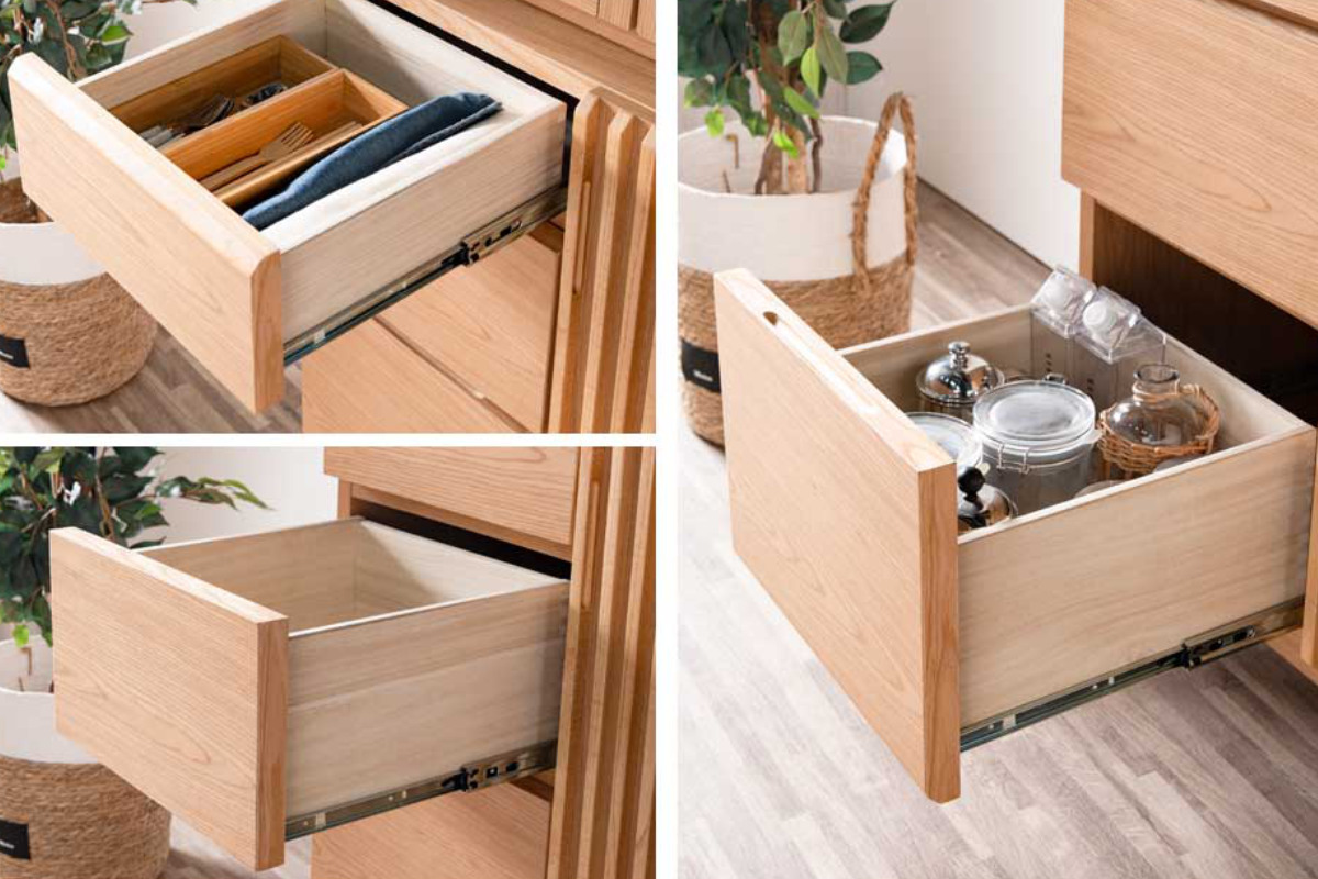 引出しにはロッキング加工を採用しており、勢いよく引いても抜け落ちず安心です。さらにフルオープンレール仕様で、奥の収納もラクに取り出せます。