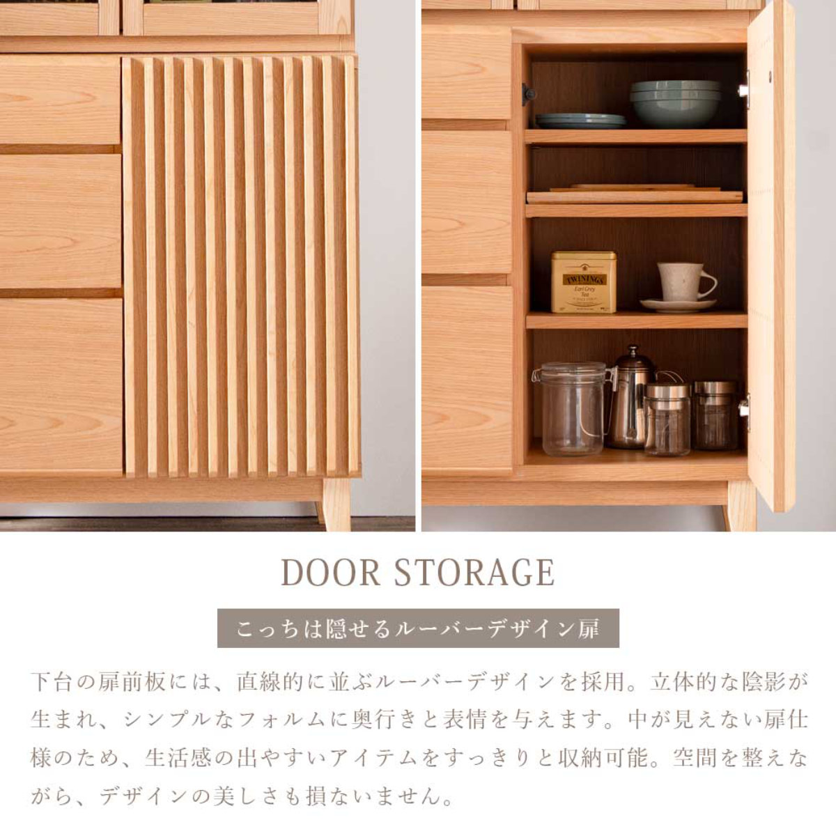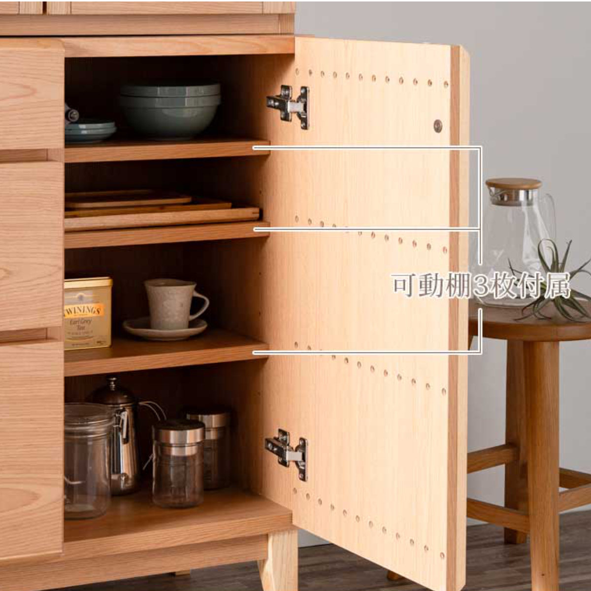 下台の扉内にも、可動棚が3枚付きです。食器や日用品、ストック品など、用途に応じて分けて使えるのも便利です。