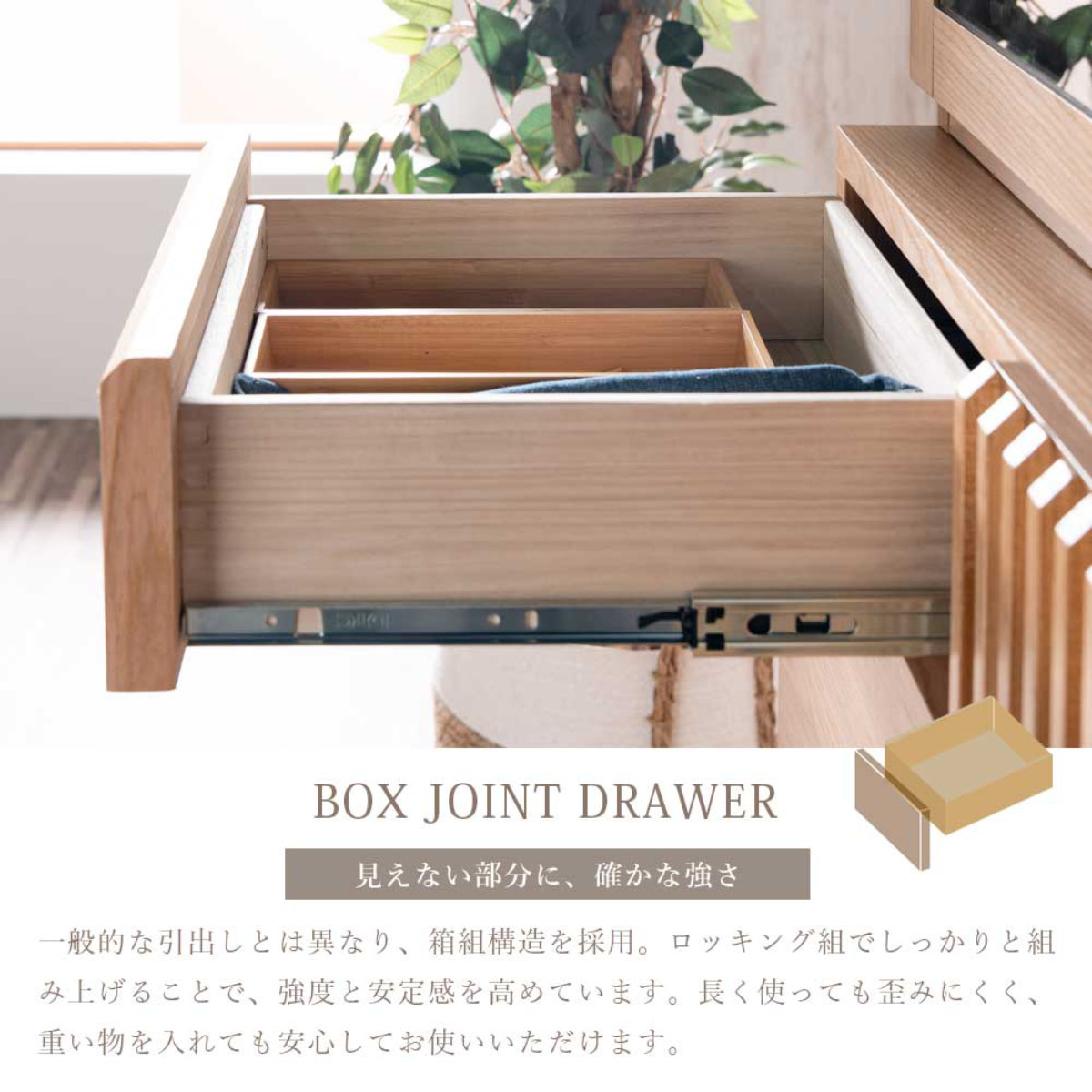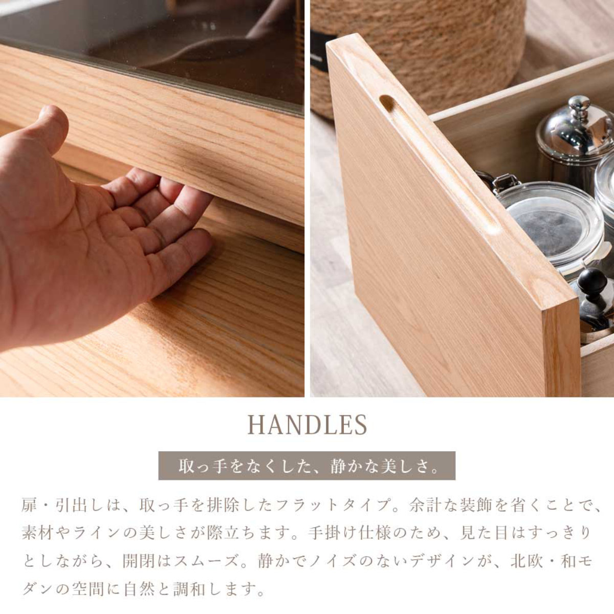 前板は天然木突板で、やさしい木目が空間に心地よくなじみます。幅80cmのコンパクトサイズながら、引出しと扉収納を備え「見せる収納」と「隠す収納」をバランスよく取り入れ、空間を整えながら美しく収納できます。