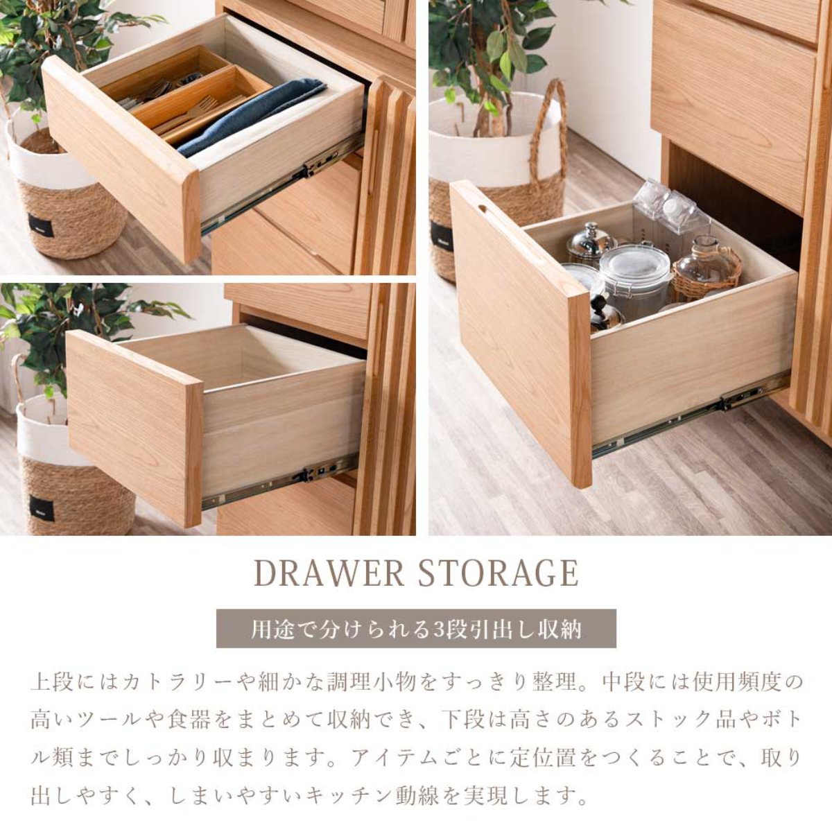 | 引き出し | 3杯 フルオープンレール仕様 浅型1段、深型2段 |