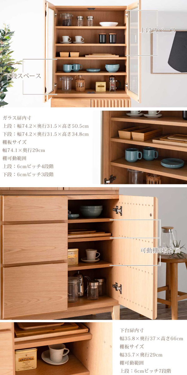 真ん中に固定棚があり、上下に分かれた棚設計で整理しやすい作りです。ガラス扉で中身が見やすく、お気に入りの食器を美しく収納できます。可動棚で高さ調整ができ、大きなグラスから小皿まで無駄なく収まります。