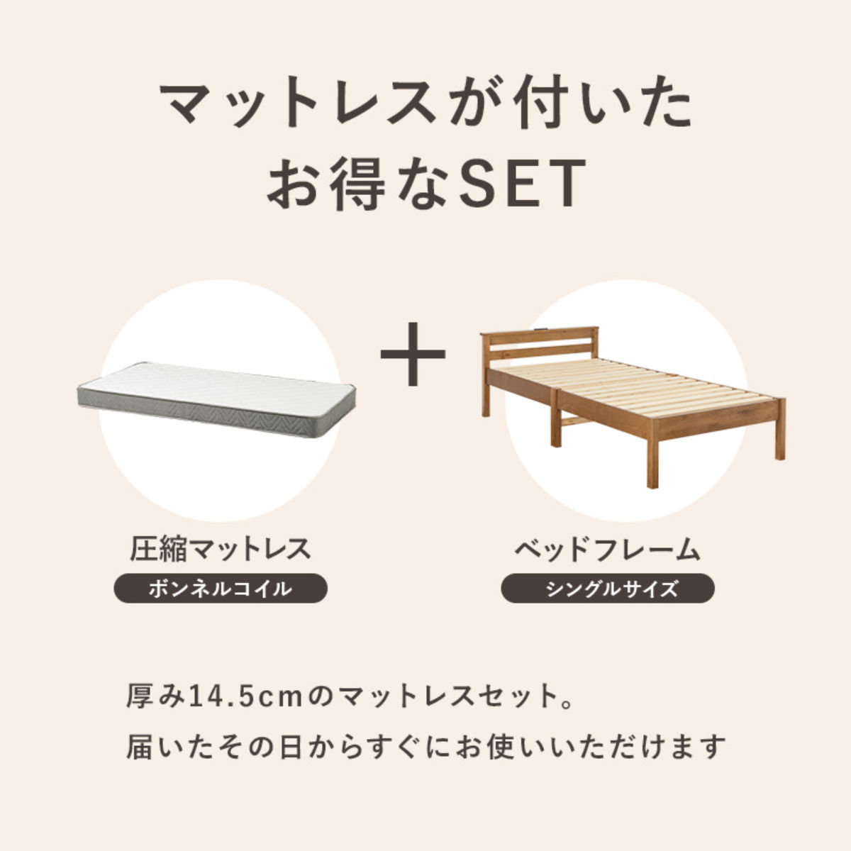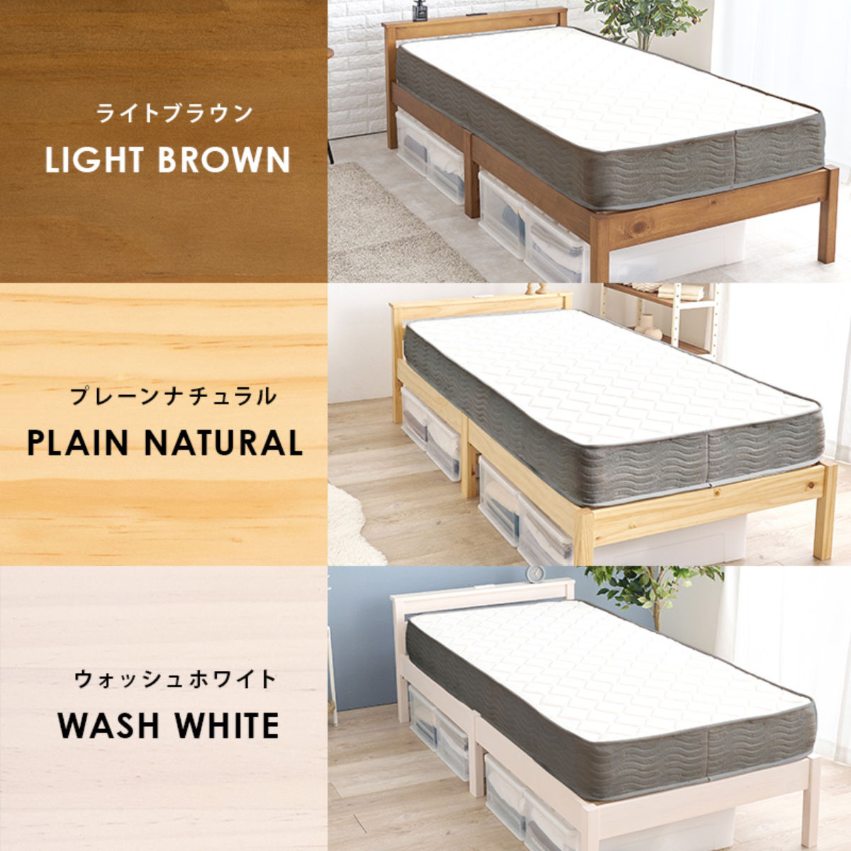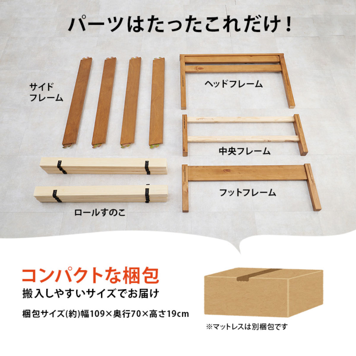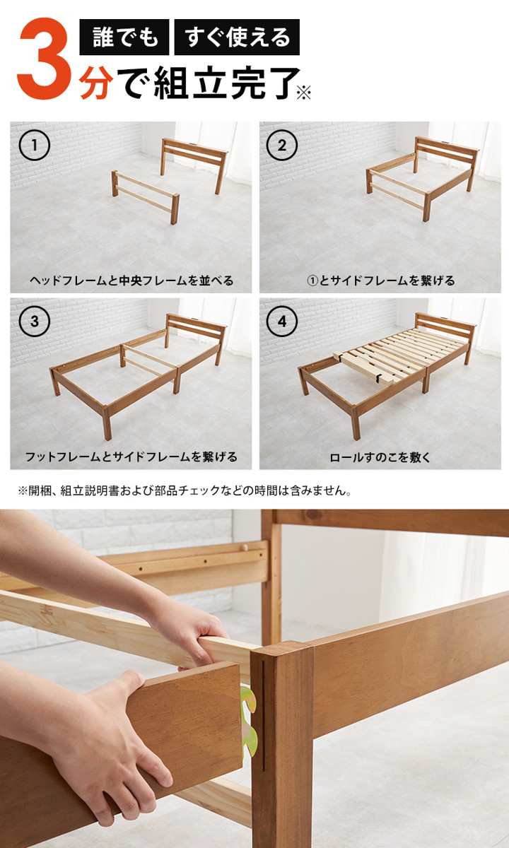 ネジも工具も不要、簡単に組み立てることができるベッドフレームとボンネルコイルマットレスのセットです。パーツを差し込むだけなので、組み立て家具が苦手な方でもたった3分で組み立てることができます。天然木の温もりが感じられる柔らかなパイン材を使用し、美しい木目と経年による色の変化を楽しめます。