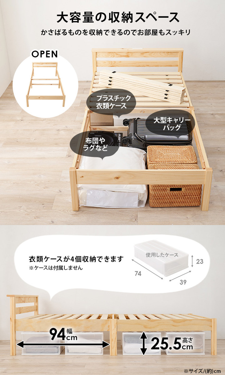 ベッド下に、キャリーバッグや布団などのかさばる物も収納できるスペースがあります。収納スペースに限りのあるお部屋でも、ベッド下のスペースを上手く使うことでスッキリと整い、ゆとりのある空間が生まれます。