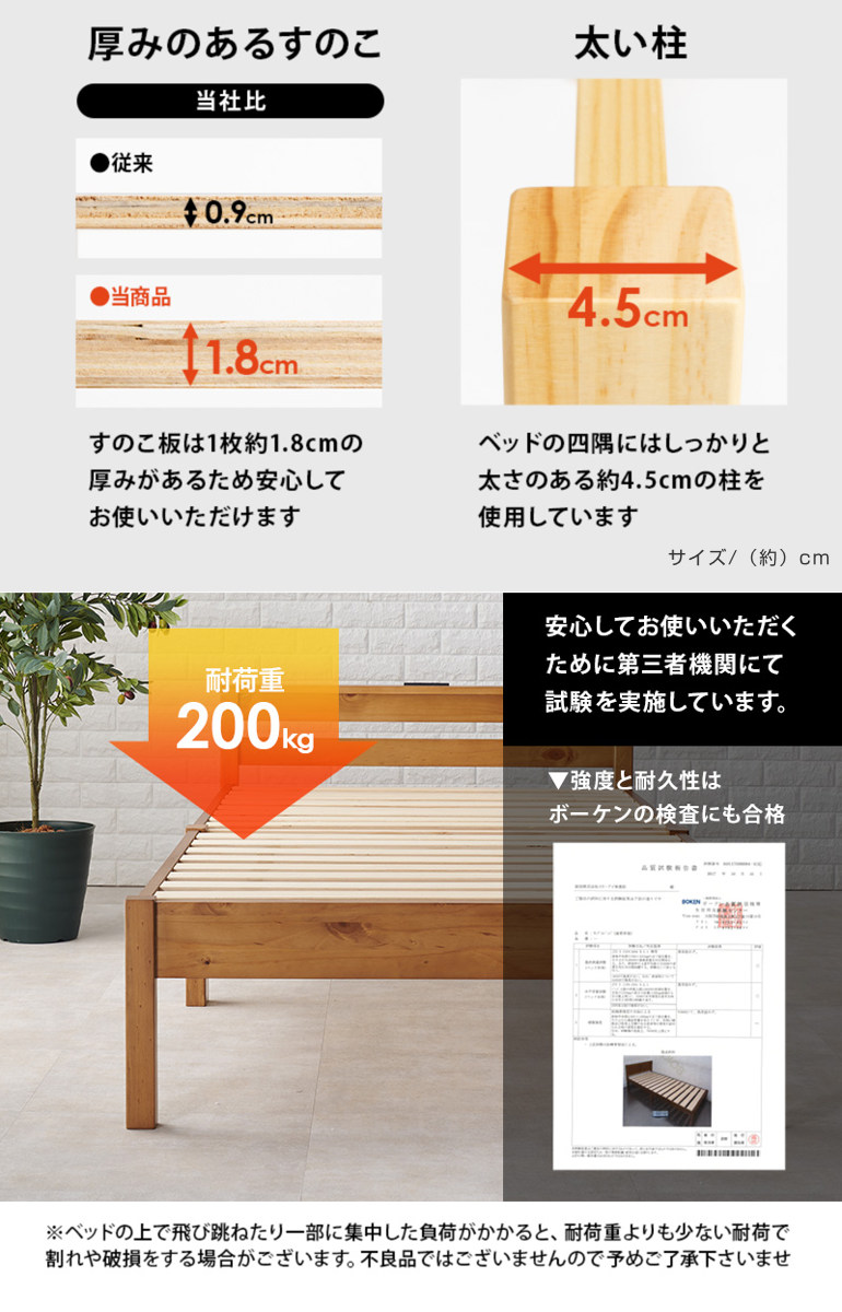 厚みのあるすのこにしっかりと太さのある柱を使用しています。高耐荷重で丈夫な作りなので、毎日安心してお使いいただけます。寝ていてもきしみにくく、抜群の安定感です。