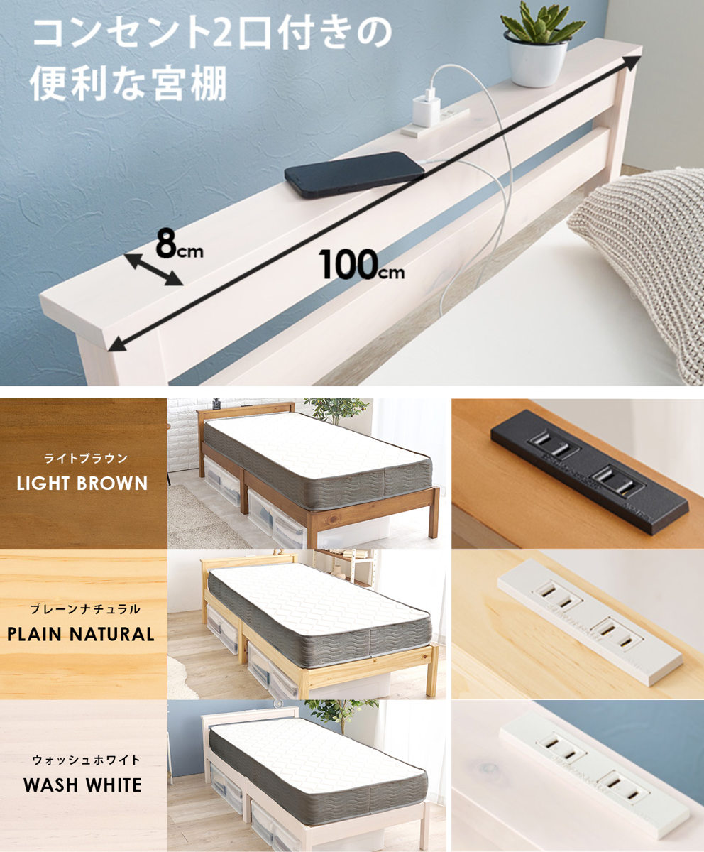 宮棚には、合計1500Wまで対応の2口コンセントを搭載。間接照明やスマートフォンの充電などに便利で、ベッド周りで快適にお使いいただけます。