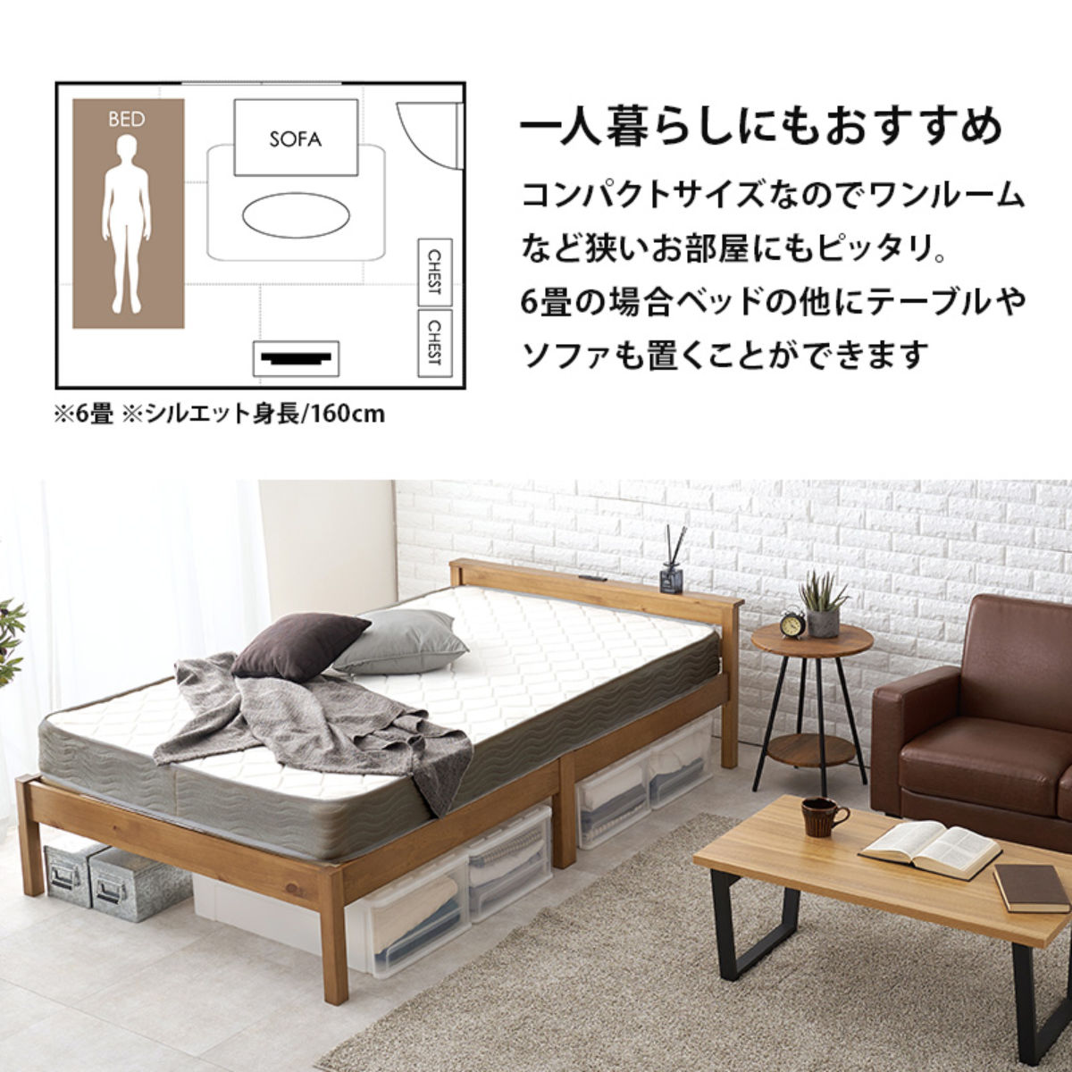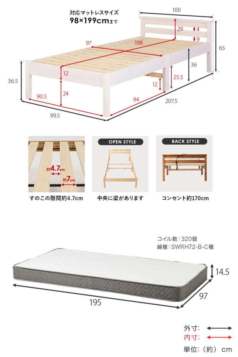 | サイズ | ベッド:約 幅100×奥行207.5×高さ65(cm) 床面高:約 36(cm) マットレス:約 幅97×奥行195×高さ14.5(cm) |