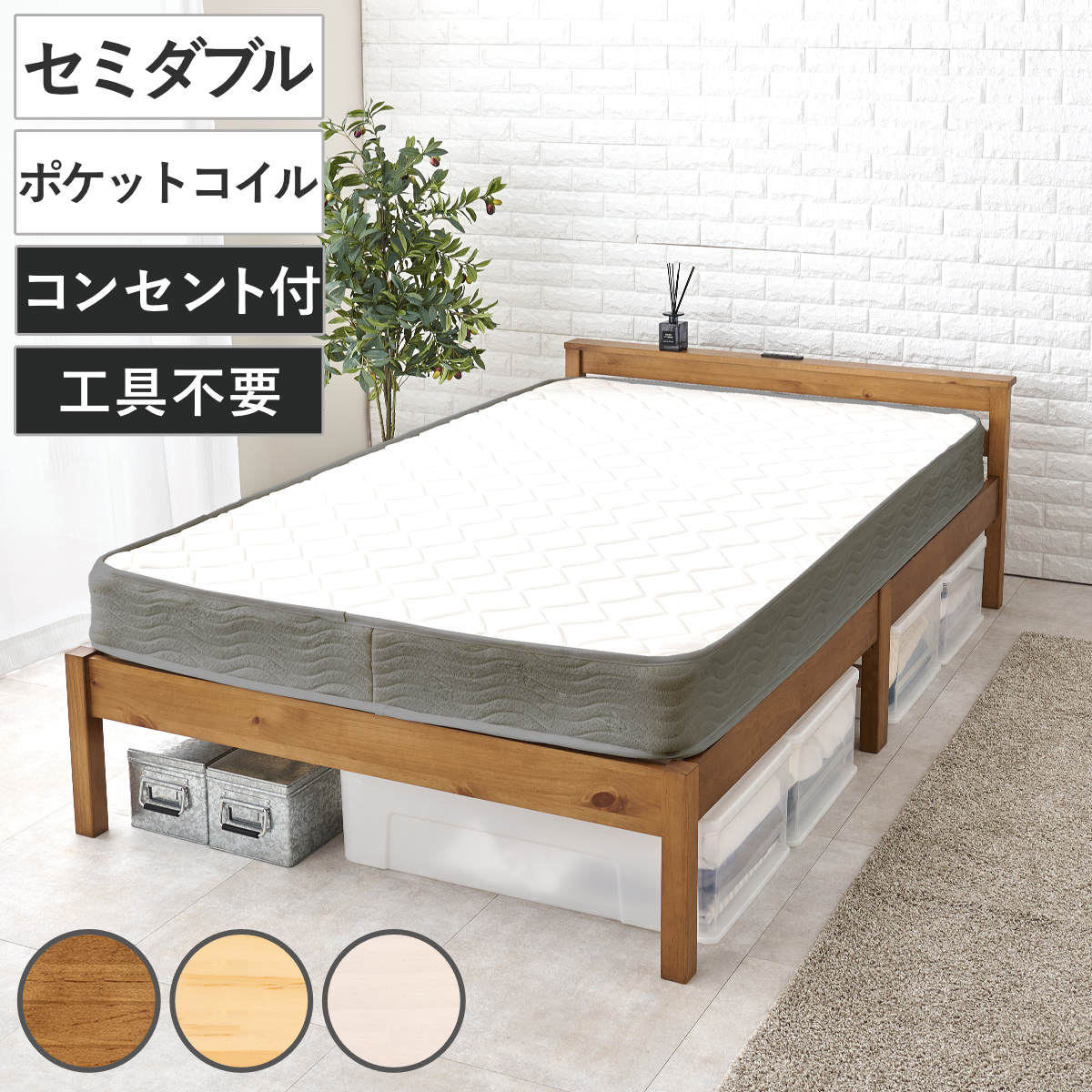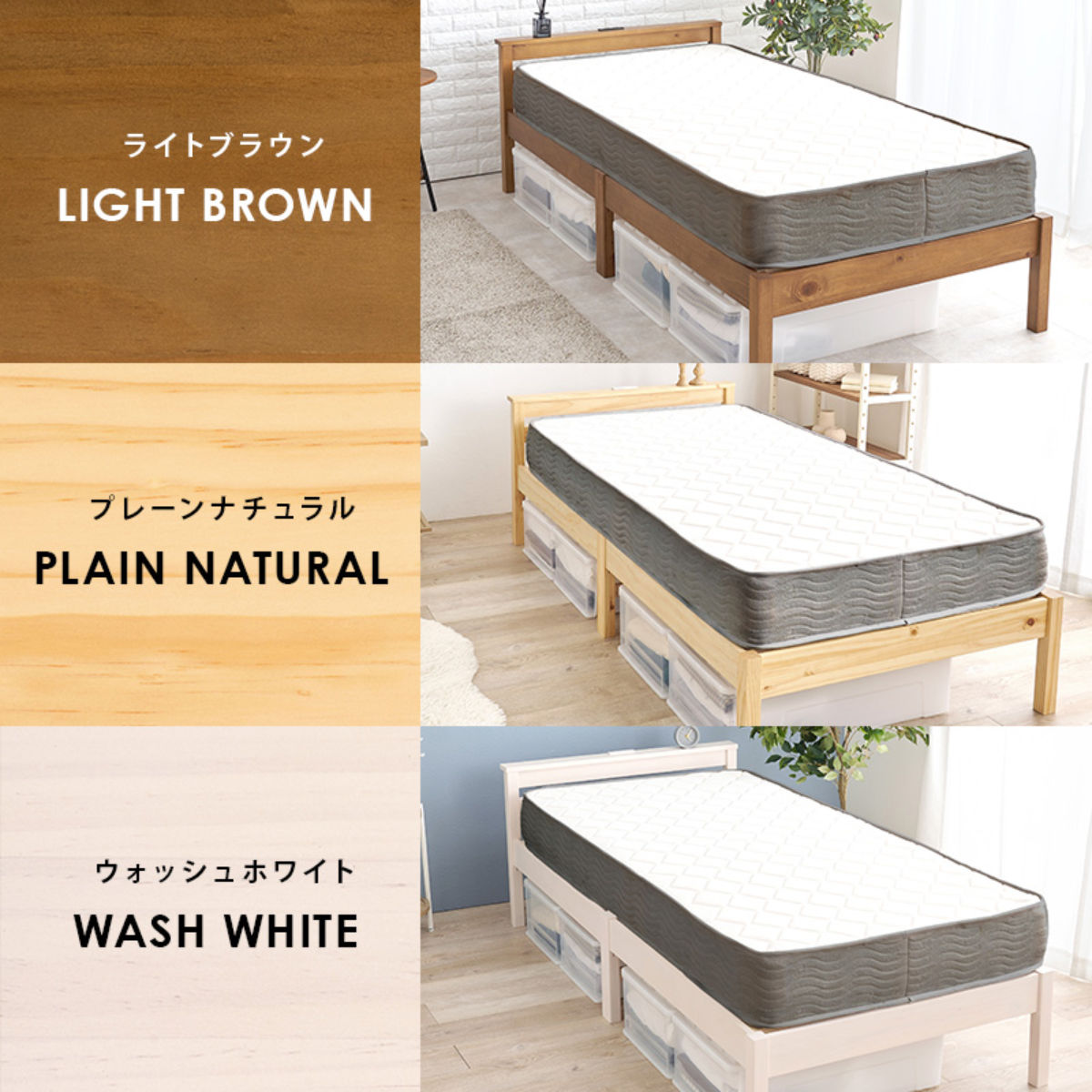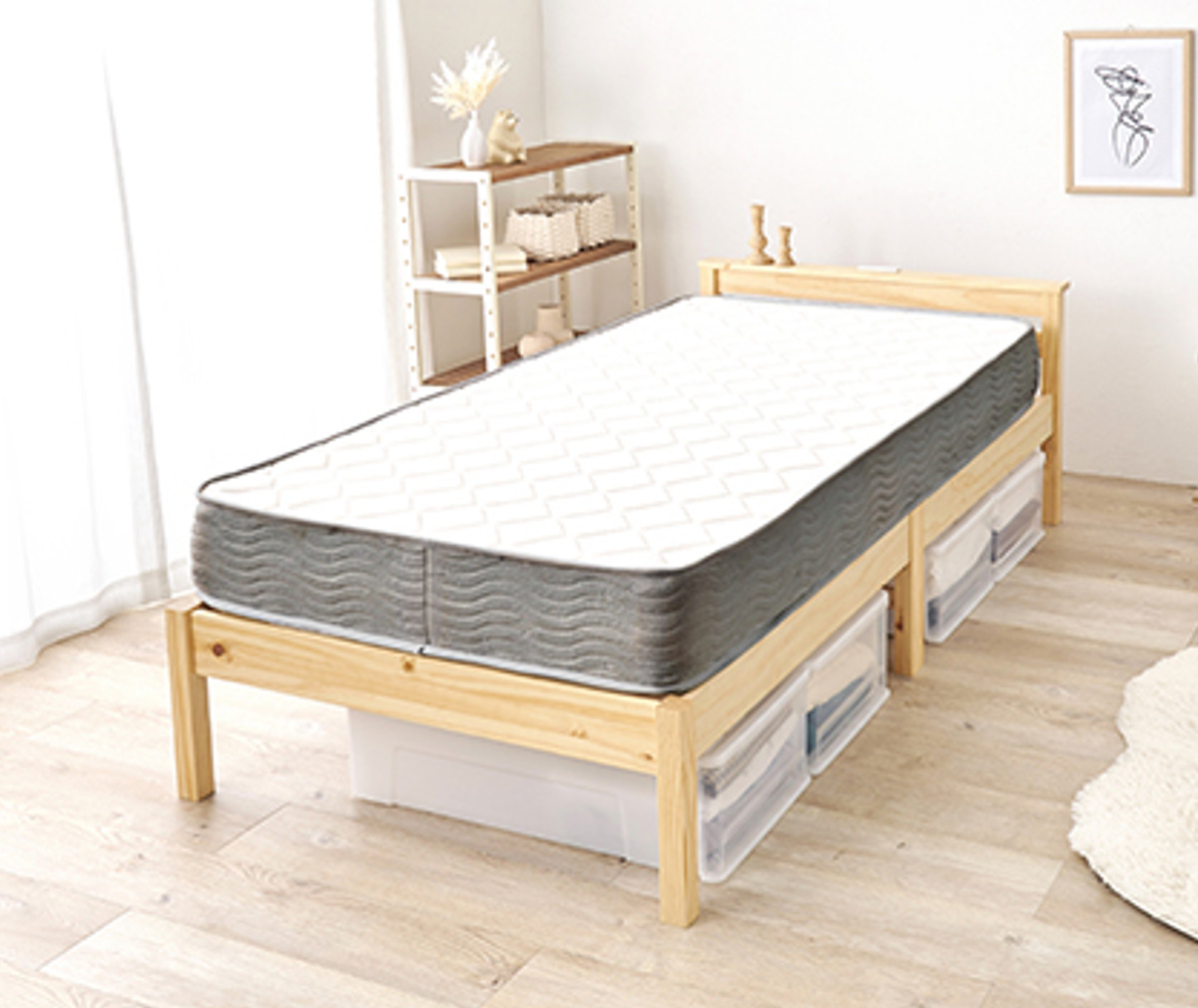 ネジも工具も不要、簡単に組み立てることができるベッドフレームとポケットコイルマットレスのセットです。パーツを差し込むだけなので、組み立て家具が苦手な方でもたった3分で組み立てることができます。天然木の温もりが感じられる柔らかなパイン材を使用し、美しい木目と経年による色の変化を楽しめます。