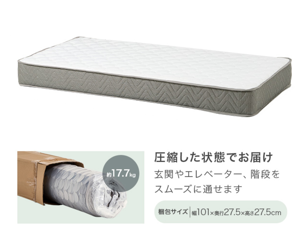 マットレスは、ロール状のコンパクトな圧縮梱包でのお届けです。大きなマットレスはベッドまでの移動が大変ですが、玄関やエレベーター、階段をスムーズに通せます。簡単に、安心して搬入・設置をしていただけます。お部屋のスペースが限られている方にもおすすめです。