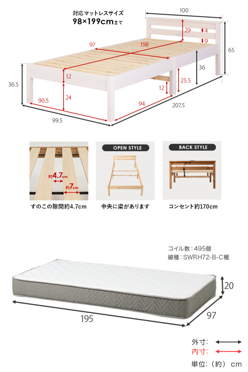 | サイズ | ベッド:約 幅100×奥行207.5×高さ65(cm) 床面高:約 36(cm) マットレス:約 幅97×奥行195×高さ20(cm) |