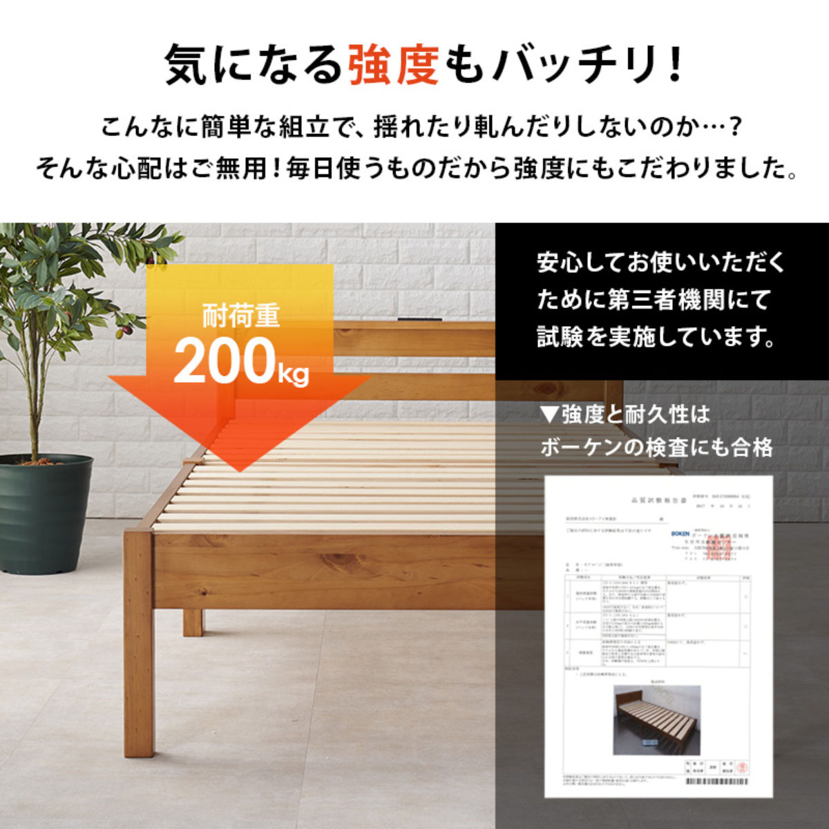 厚みのあるすのこにしっかりと太さのある柱を使用しています。高耐荷重で丈夫な作りなので、毎日安心してお使いいただけます。寝ていてもきしみにくく、抜群の安定感です。