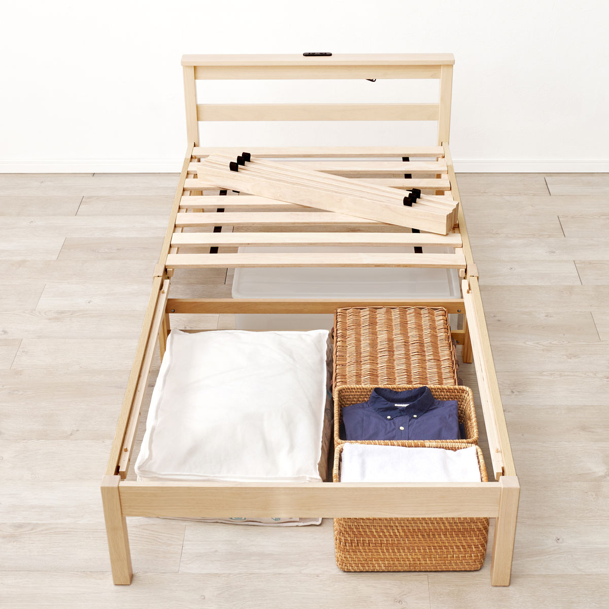ネジや工具が不要で、簡単に組み立てられるベッドフレームです。パーツを差し込むだけなので、組み立て家具が苦手な方でもたった3分で組み立てられます。天然木の温もりを感じられるラバーウッド材を使用しており、なめらかで均一な木目と、使い込むほどに深まる風合いの変化をお楽しみいただけます。