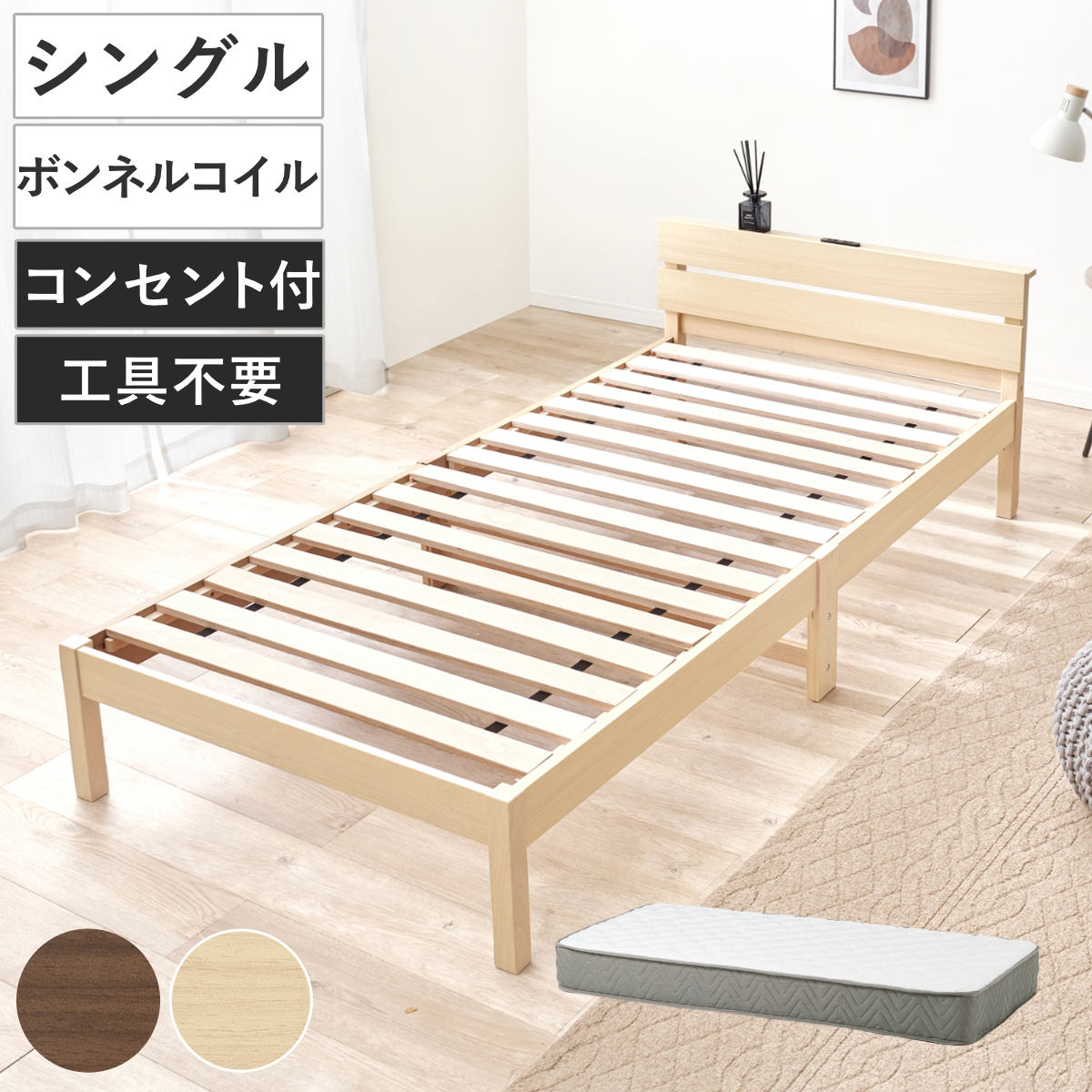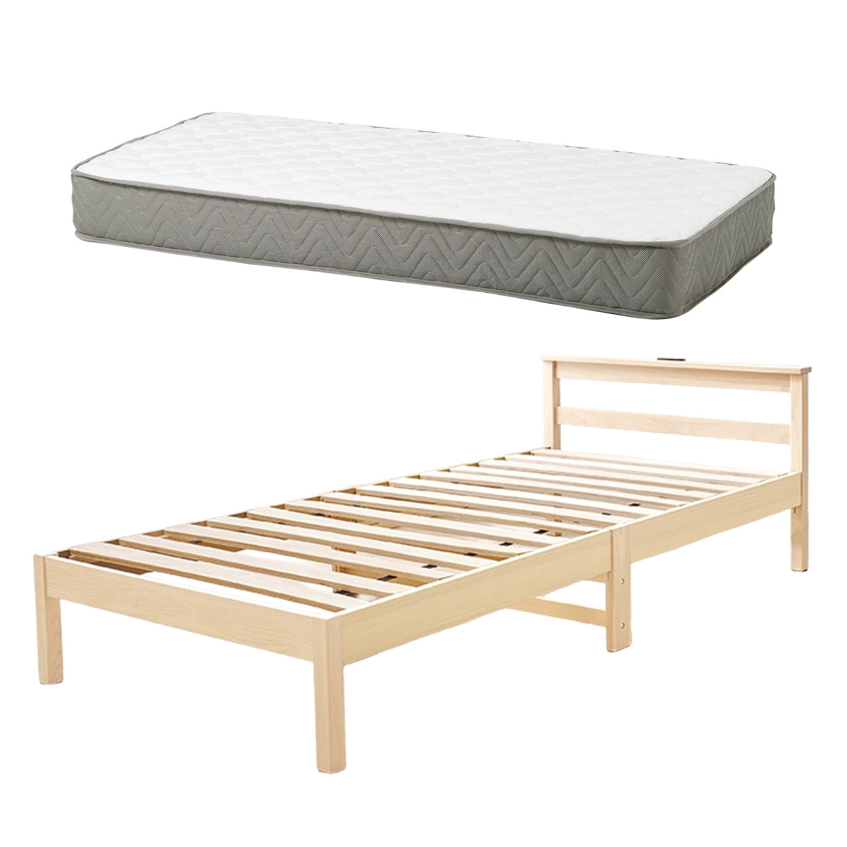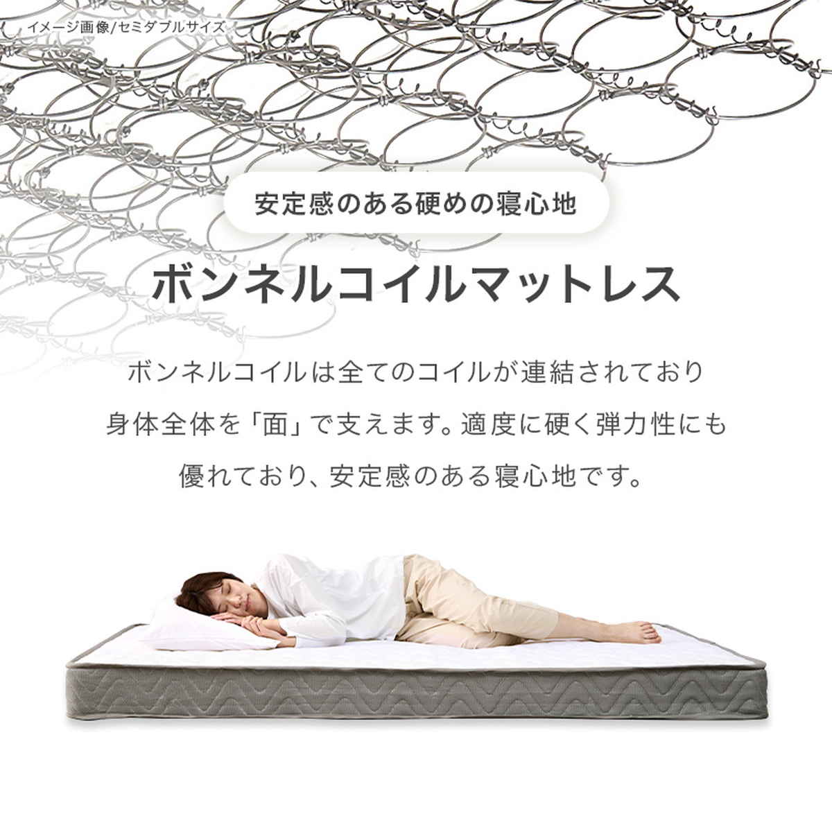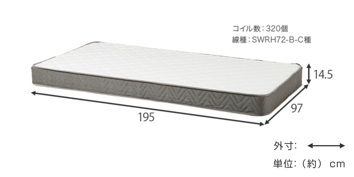 | 材質 | ベッド:〈主材〉天然木(ラバーウッド)、プリント化粧パーティクルボード マットレス:〈主材〉ボンネルコイル(コイル数:320個)、〈張地〉ポリエステル |