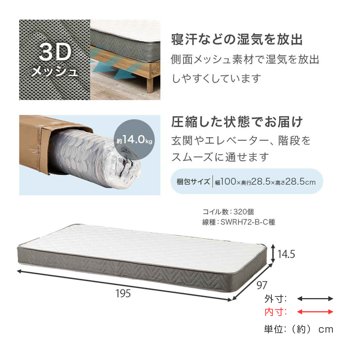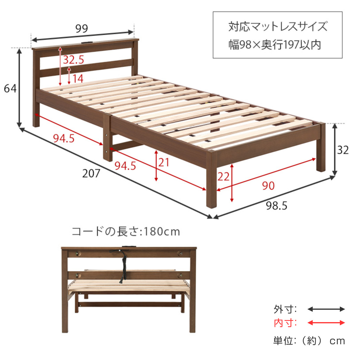 | サイズ | ベッド:約 幅99×奥行207×高さ64×床面高32(cm) マットレス:約 幅97×奥行195×高さ14.5(cm) |