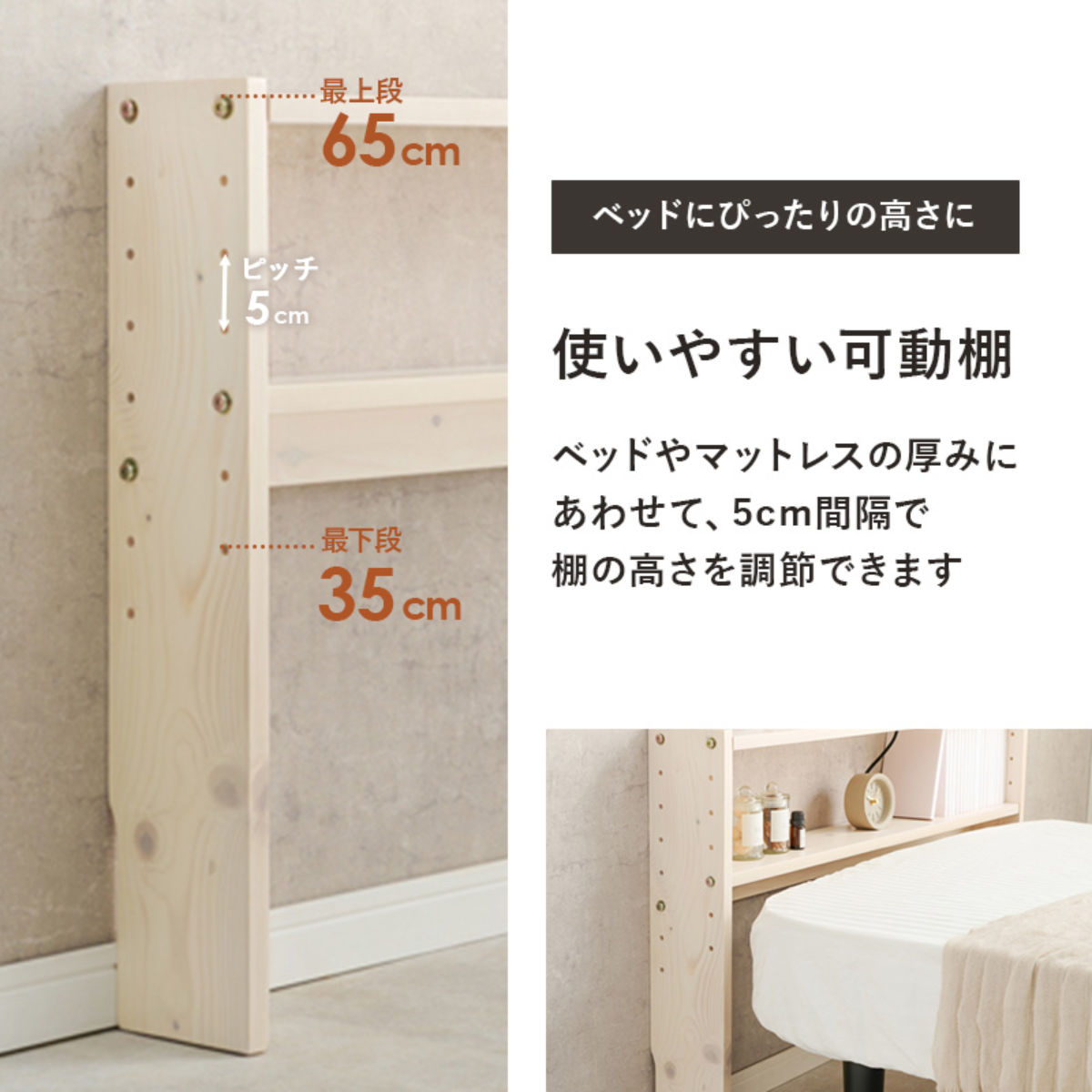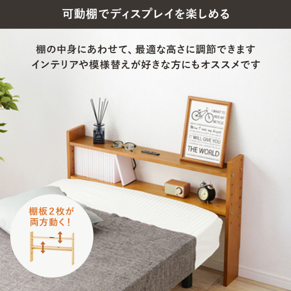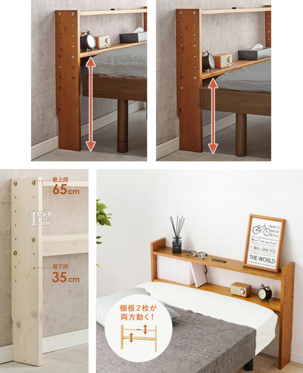 ヘッドボードの棚板は2枚とも、ベッドの高さやマットレスの厚みに合わせて、5cm間隔で高さ調節が可能です。ぴったりの高さに設定できるため使いやすく、見た目にも統一感のあるすっきりとした印象に。さらに、置くものに合わせて高さを変えられるので、お気に入りのインテリアを飾ってディスプレイも楽しめます。