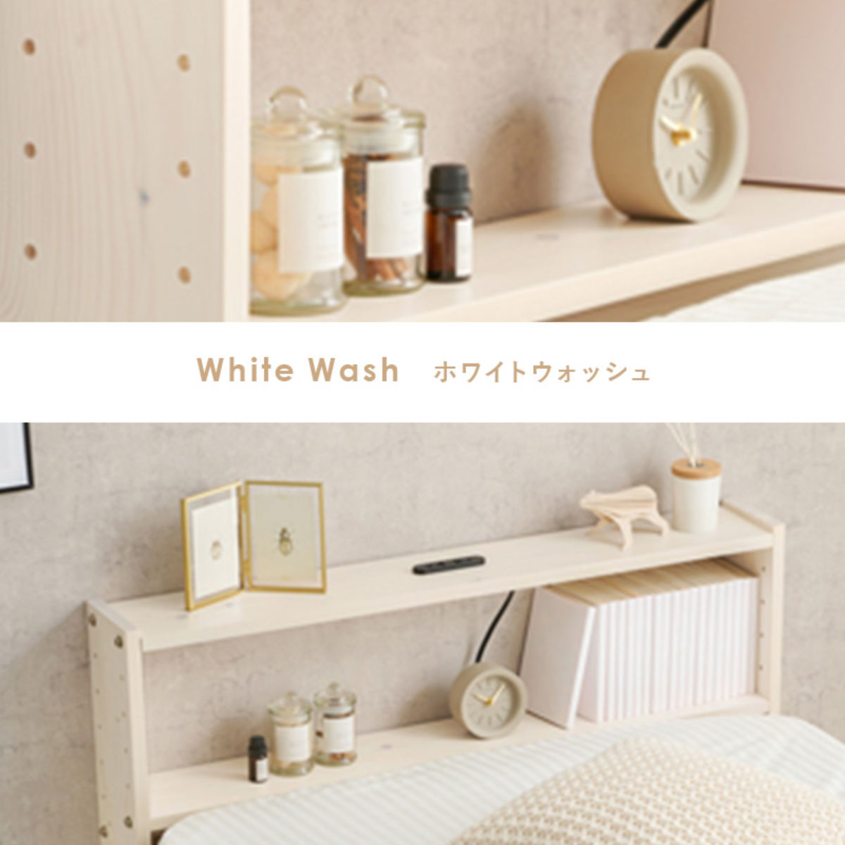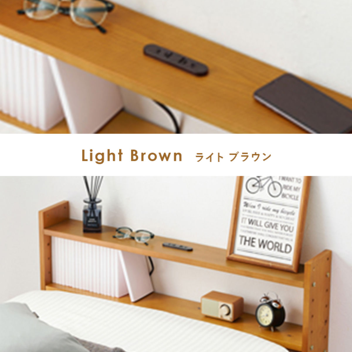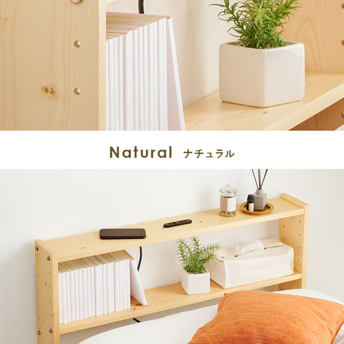 ヘッドボードの棚板は2枚とも、ベッドの高さやマットレスの厚みに合わせて、5cm間隔で高さ調節が可能です。ぴったりの高さに設定できるため使いやすく、見た目にも統一感のあるすっきりとした印象に。さらに、置くものに合わせて高さを変えられるので、お気に入りのインテリアを飾ってディスプレイも楽しめます。