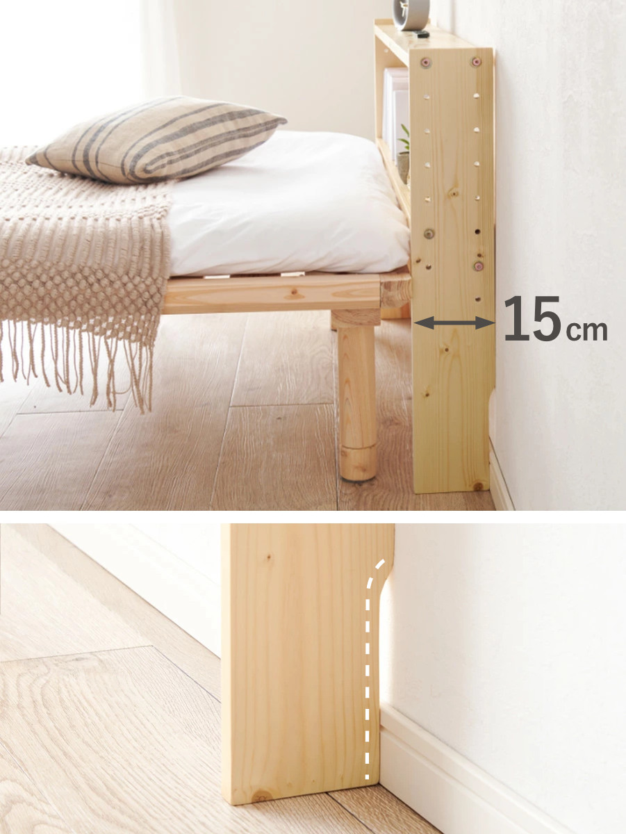 奥行約15cmのスリムタイプで、枕元に置いても圧迫感を感じにくい薄型設計です。幅木よけ加工が施されているため、壁にぴったりと設置でき、無駄なすき間を作らずすっきりと収まります。