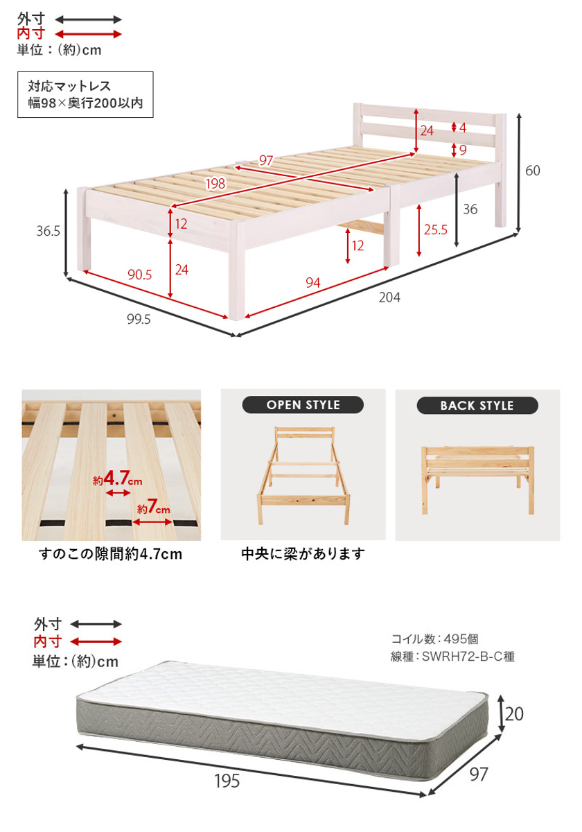 | サイズ | ベッド:約 幅99.5×奥行204×高さ60×床面高36cm マットレス:約 幅97×奥行195×高さ20cm |