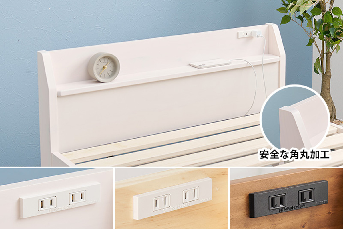 携帯や本、目覚まし時計などを置けるスペースがあり、2口コンセントも付いているのでライトの使用や充電も可能です。
