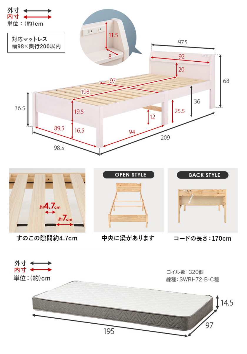 | サイズ | ベッド:約 幅98.5×奥行209×高さ68×床面高36cm マットレス:約 幅97×奥行195×高さ14.5cm |